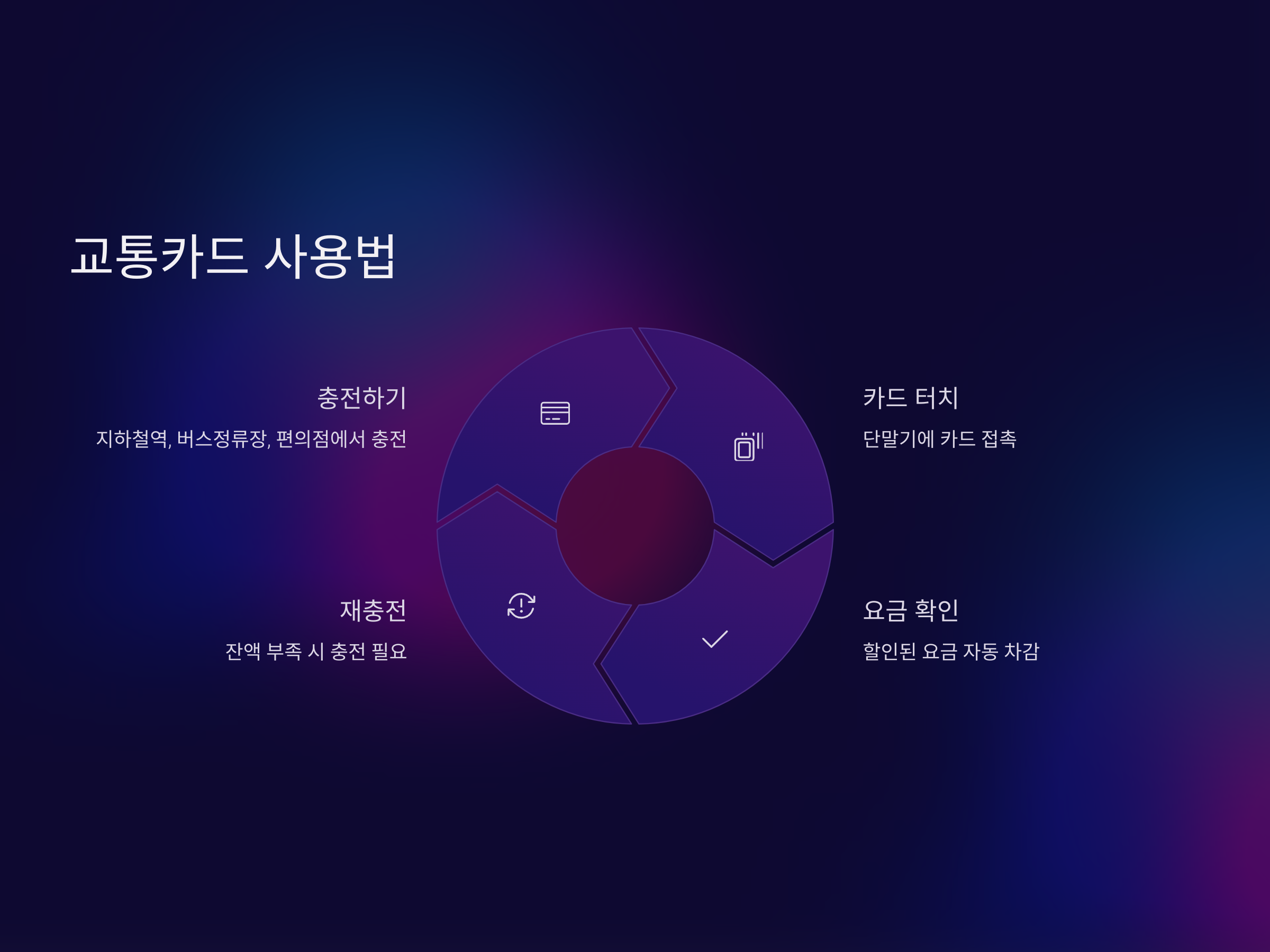 교통카드를 사용할 때는 버스나 지하철, 택시 등에서 카드 단말기에 카드를 대기만 하면 됩니다. 카드를 대면 자동으로 요금이 차감되며, 카드에 잔액이 부족하면 알림이 뜨고 충전을 해야만 다시 이용할 수 있습니다.