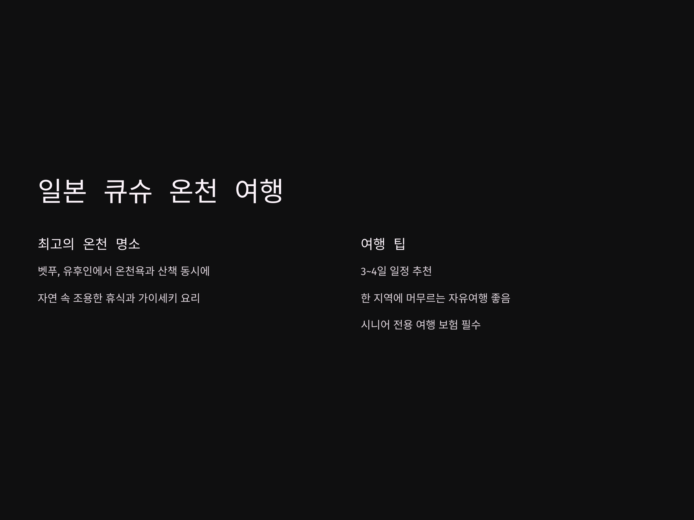 일본 큐슈 지역은 시니어 여행자들에게 최고의 온천 명소로 손꼽힙니다. 벳푸, 유후인 같은 도시는 온천욕과 산책을 동시에 즐길 수 있어 몸과 마음의 피로를 풀기에 제격입니다. 특히 유후인의 료칸들은 자연 속에서 조용한 휴식을 제공하며, 일본 전통 가이세키 요리로 미각까지 만족시켜줍니다. 큐슈는 한국과 가까워 비행 시간이 짧고, 현지 교통도 잘 발달되어 있어 여행 부담이 적은 것이 장점입니다.