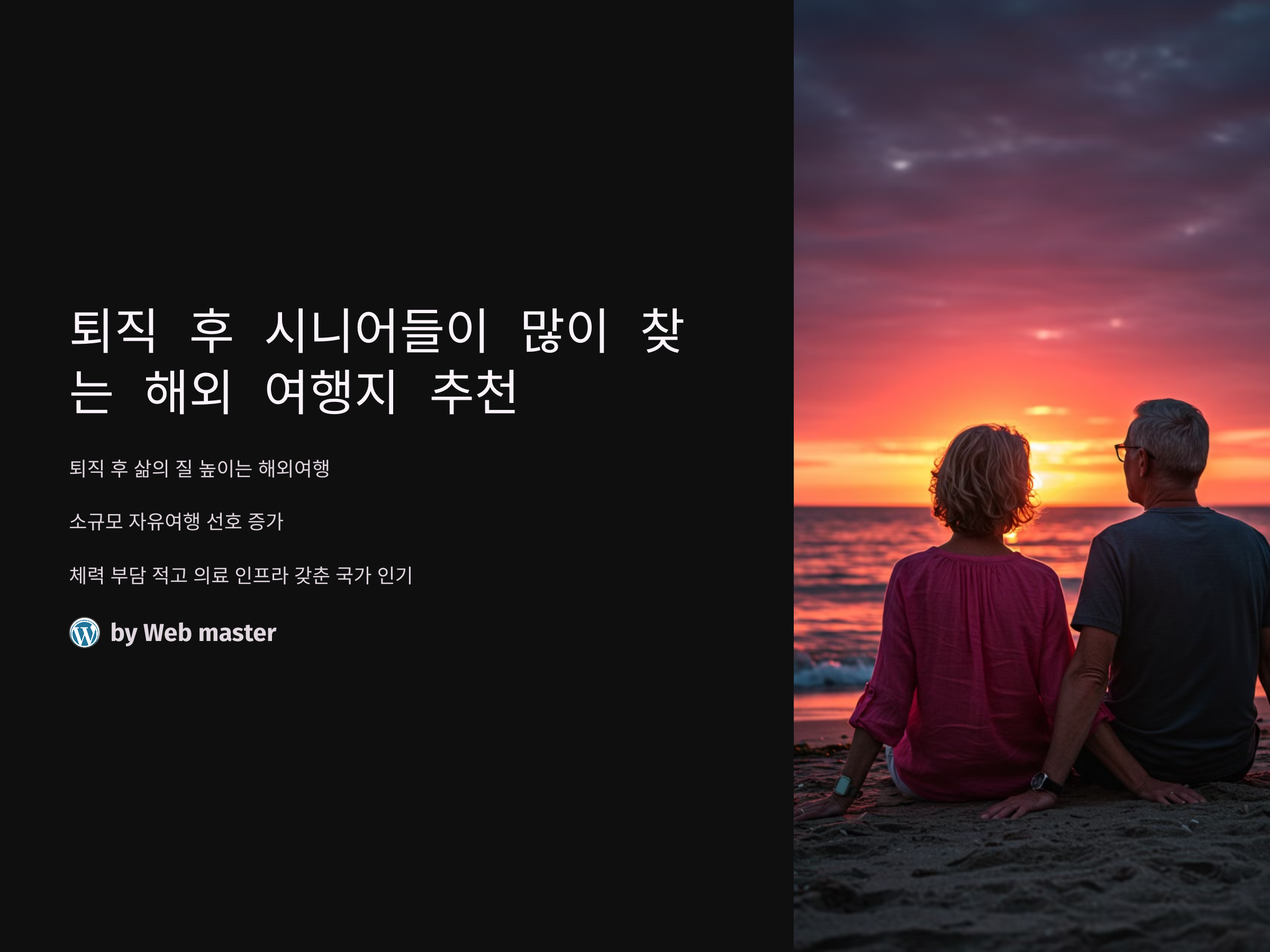 이 글에서는 여행 만족도를 높이기 위한 조건들을 고려해, 안전하고 편안하며 감동적인 순간을 선사할 수 있는 시니어 맞춤 해외 여행지를 6곳 추천해드립니다. 각 여행지의 특징과 장점, 추천 일정, 주의사항까지 상세히 알려드리니 끝까지 읽어보시고 퇴직 후 인생의 두 번째 챕터를 아름답게 시작해보세요.