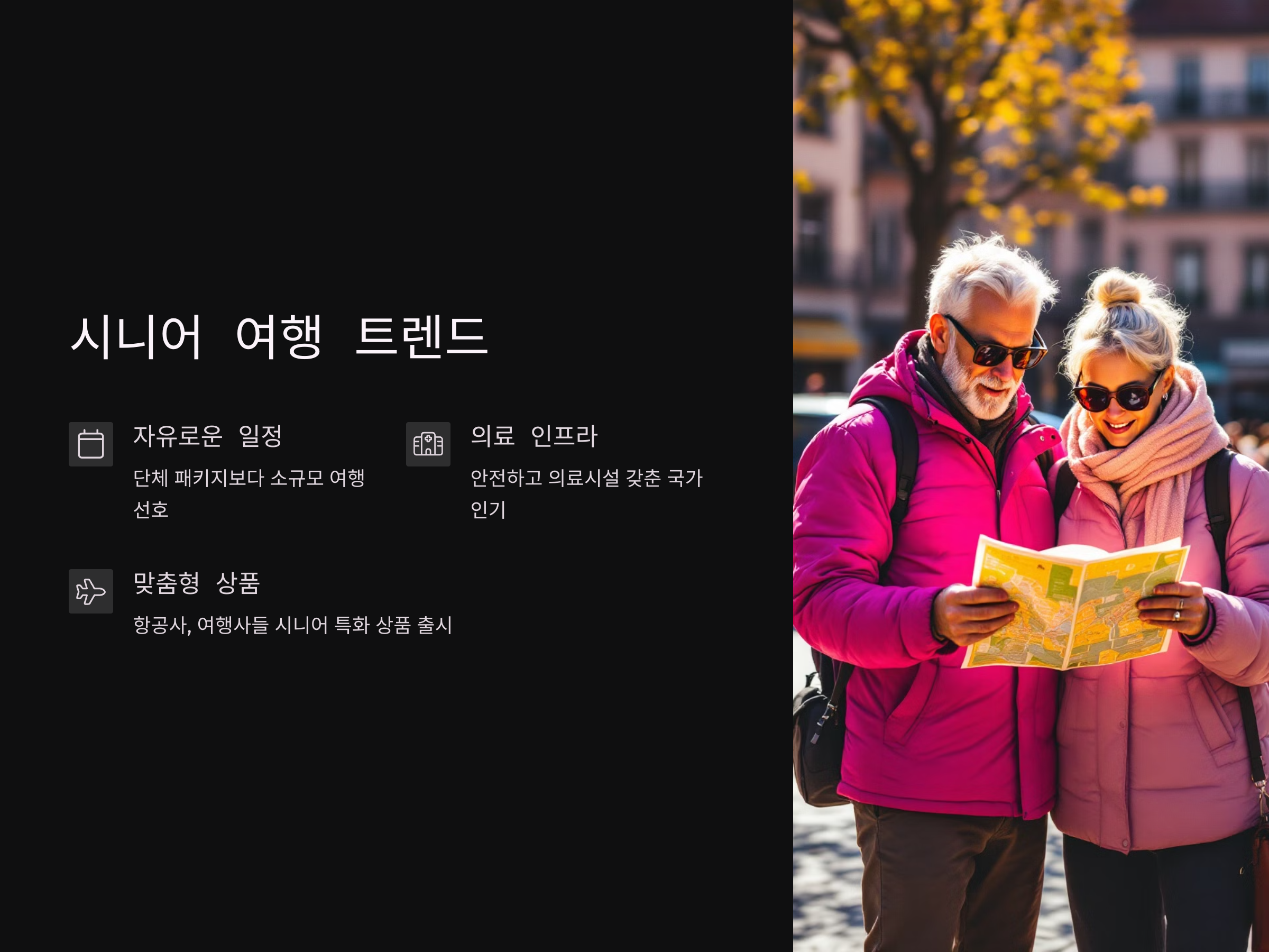 퇴직 후 삶의 질을 높이기 위한 선택으로 해외 여행을 고려하는 시니어층이 급격히 늘어나고 있습니다. 최근 트렌드로는 단체 패키지보다 자유로운 일정의 소규모 여행이 각광받고 있으며, 체력 부담이 적고 의료 인프라가 잘 갖춰진 국가가 선호됩니다. 특히 유럽의 역사 도시, 일본의 온천 마을, 동남아의 힐링 휴양지 등이 주목받고 있습니다. 이처럼 변화하는 여행 트렌드는 고령 인구 증가와 함께 시니어 여행 시장을 새로운 블루오션으로 만들고 있으며, 이에 발맞춰 항공사, 여행사들도 시니어 맞춤 상품을 속속 출시하고 있는 추세입니다.