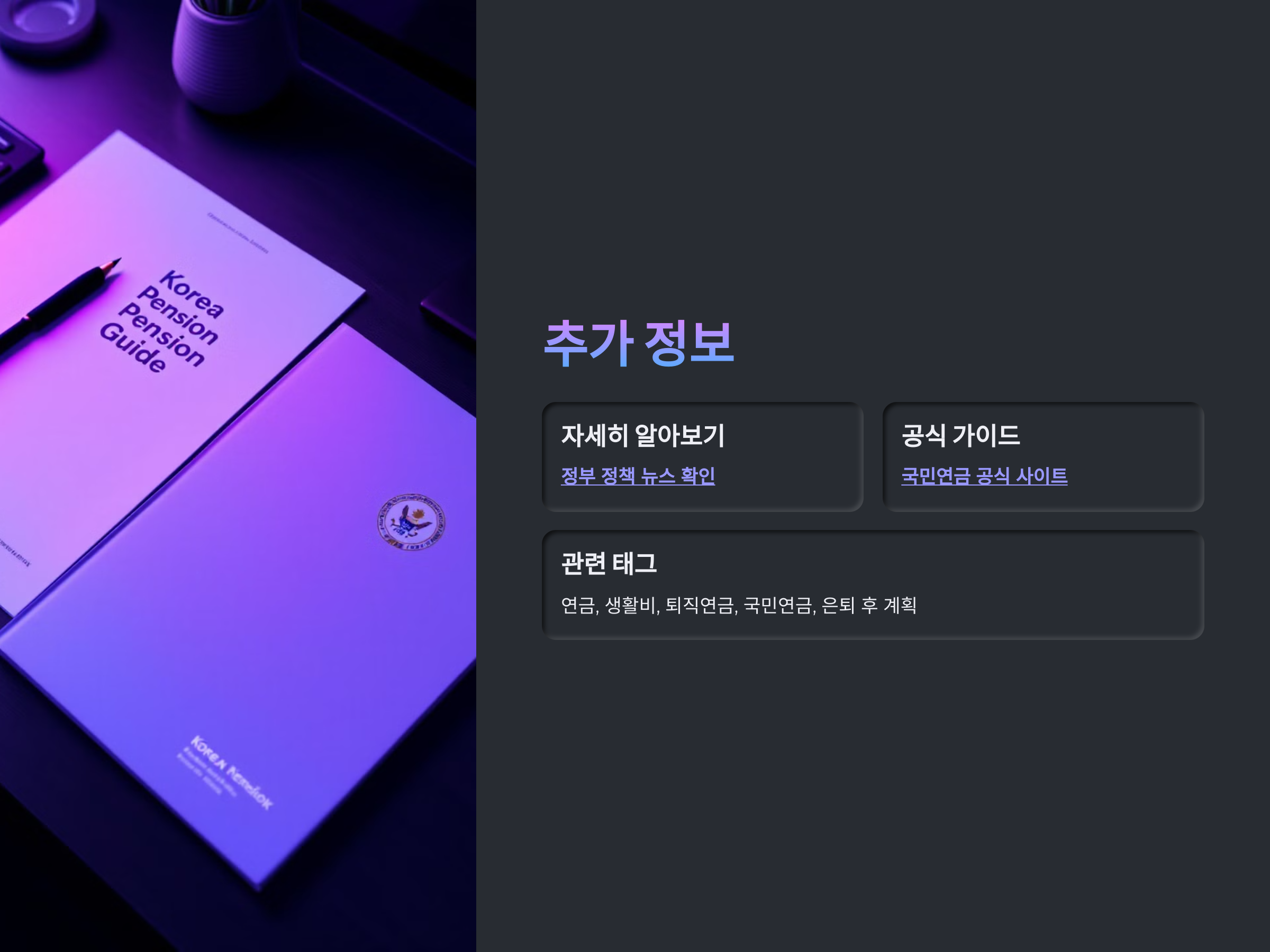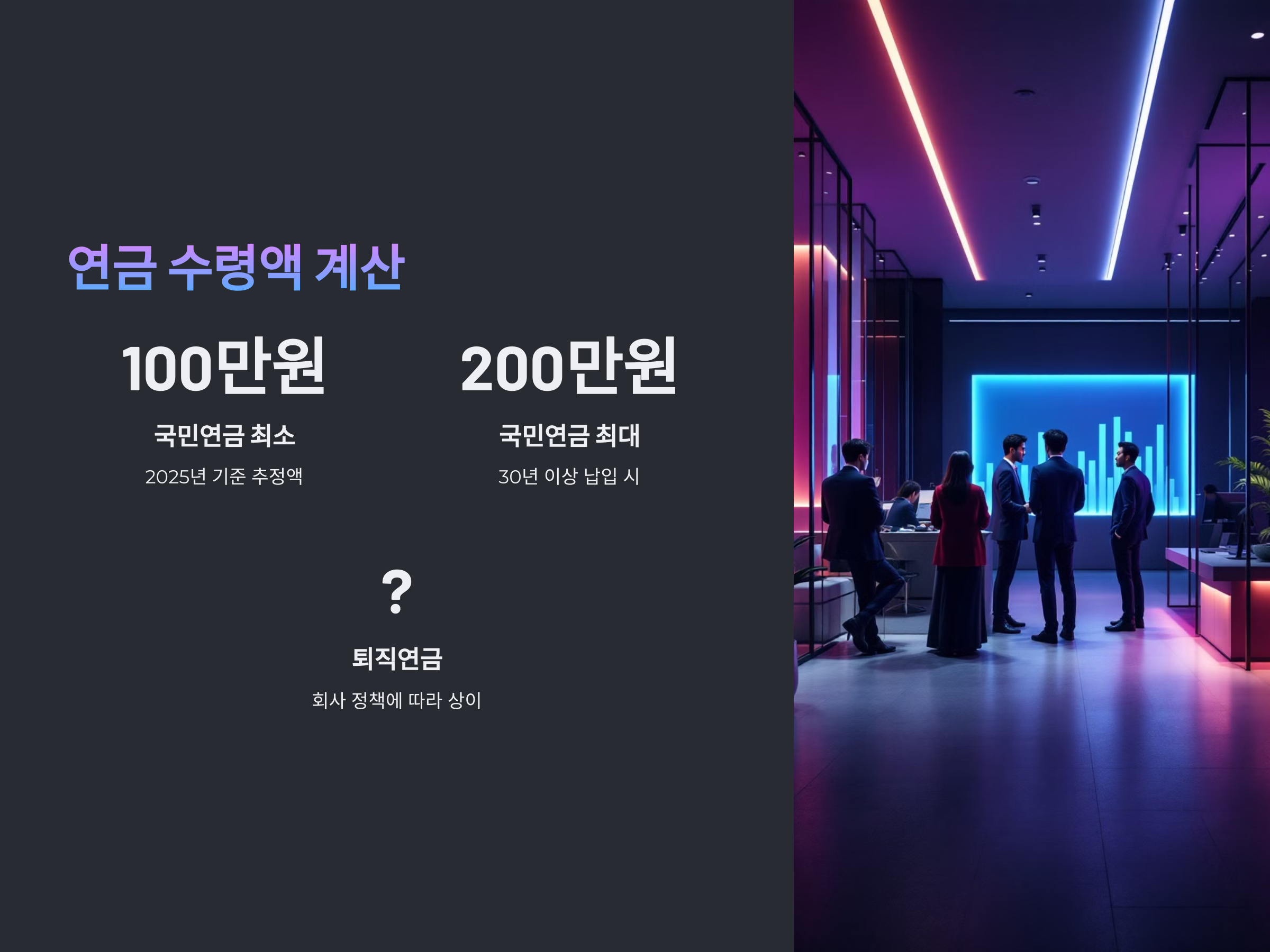 하지만, 대부분의 사람들은 이 금액만으로는 생활이 어려울 수 있으므로, 퇴직연금이나 다른 자산을 통해 추가적인 소득을 마련해야 합니다. 퇴직연금은 회사마다 다르게 운영되므로, 회사에서 제공하는 연금 상품을 잘 파악하고 자신에게 맞는 옵션을 선택하는 것이 필요합니다.