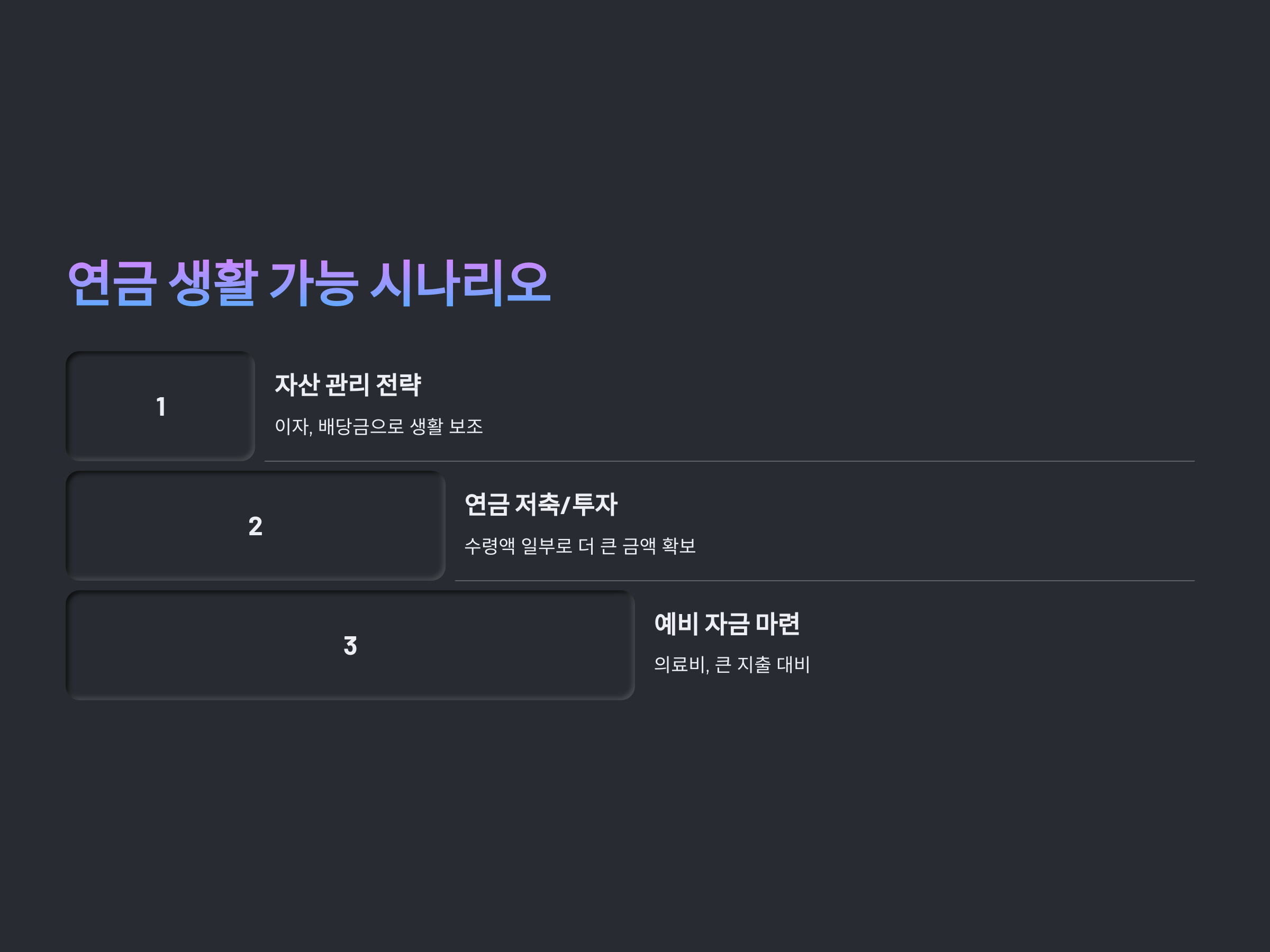 연금을 받기 전에 자산을 축적해 놓으면, 연금 수령액이 부족한 상황에서도 대체 수단으로 자산을 활용할 수 있습니다. 이 방법은 특히 은퇴 후 어느 정도 자산을 관리할 수 있는 능력이 있는 사람들에게 추천됩니다.