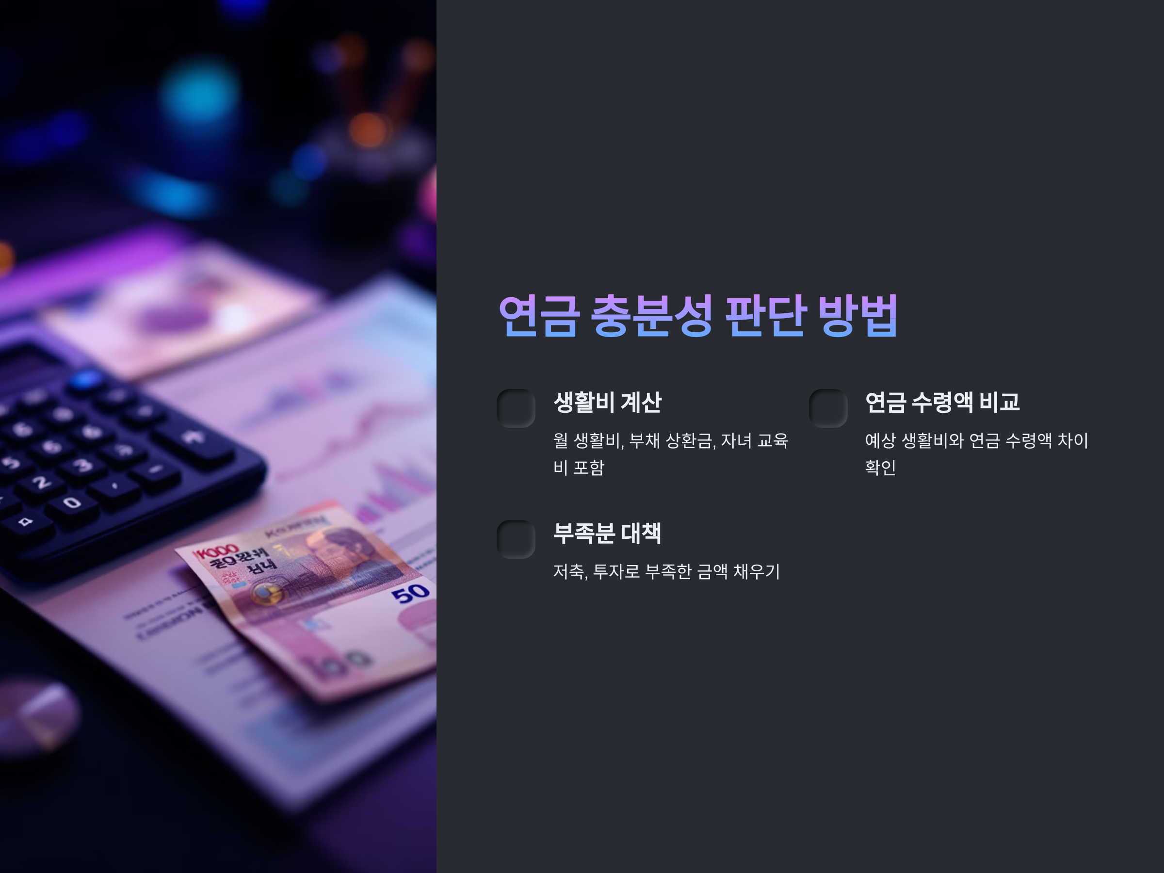 이를 계산하기 위한 방법은 간단합니다. 월 생활비를 계산한 후, 연금 수령액이 그보다 얼마나 부족한지 체크한 뒤, 그 부족한 금액을 채우기 위해 별도의 저축이나 투자 전략을 세울 필요가 있습니다. 이 계산법을 통해, 연금만으로 생활 가능한지를 실제적으로 파악할 수 있습니다.