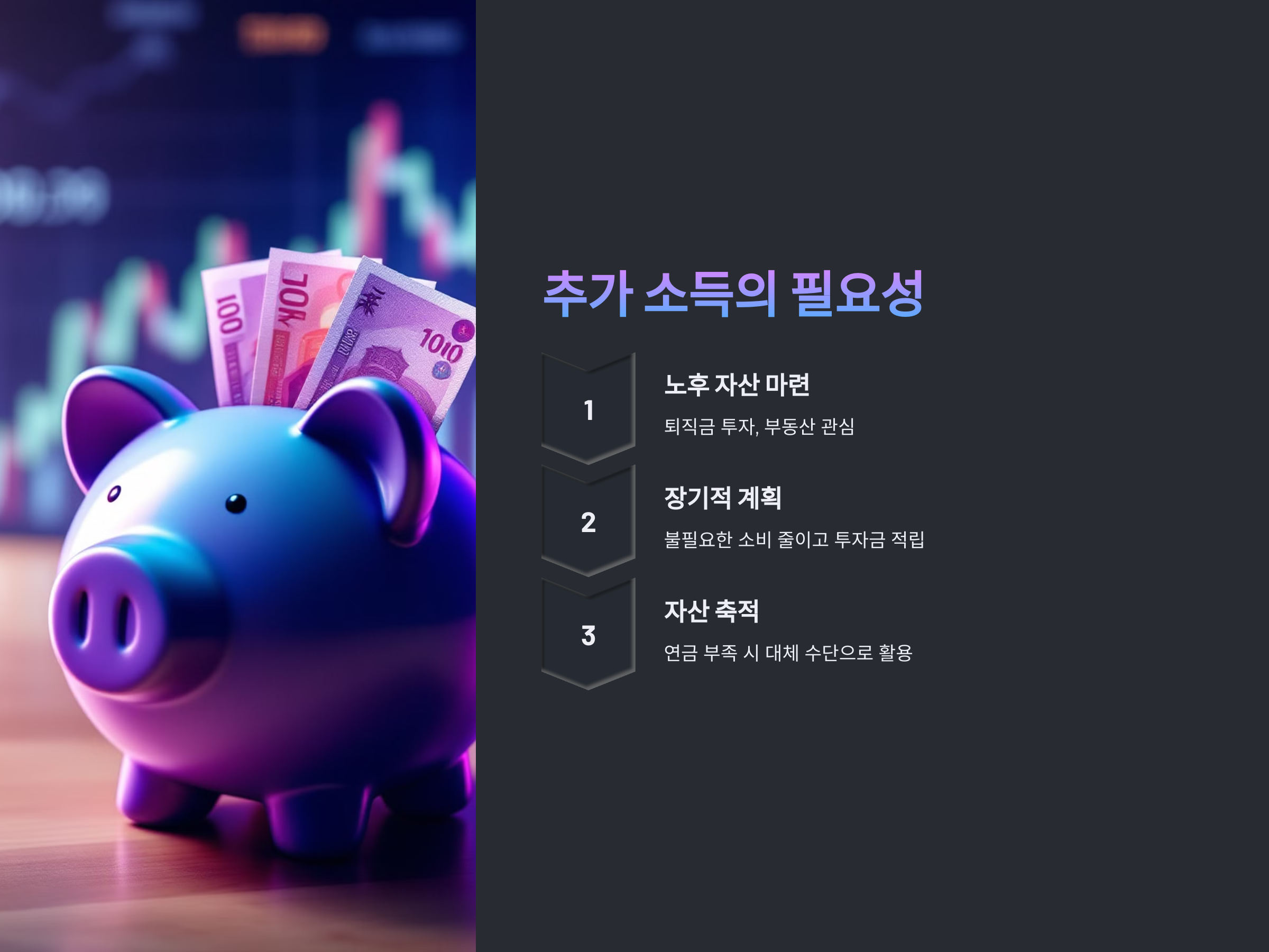 또한, 중간 연령대에서부터 연금 외의 소득을 준비하는 것이 중요한데, 이를 위해서는 장기적인 계획을 세워야 합니다. 불필요한 소비를 줄이고, 투자에 필요한 금액을 매월 조금씩 적립하면서 노후 자산을 마련해가는 방법이 가장 안전한 전략일 수 있습니다.