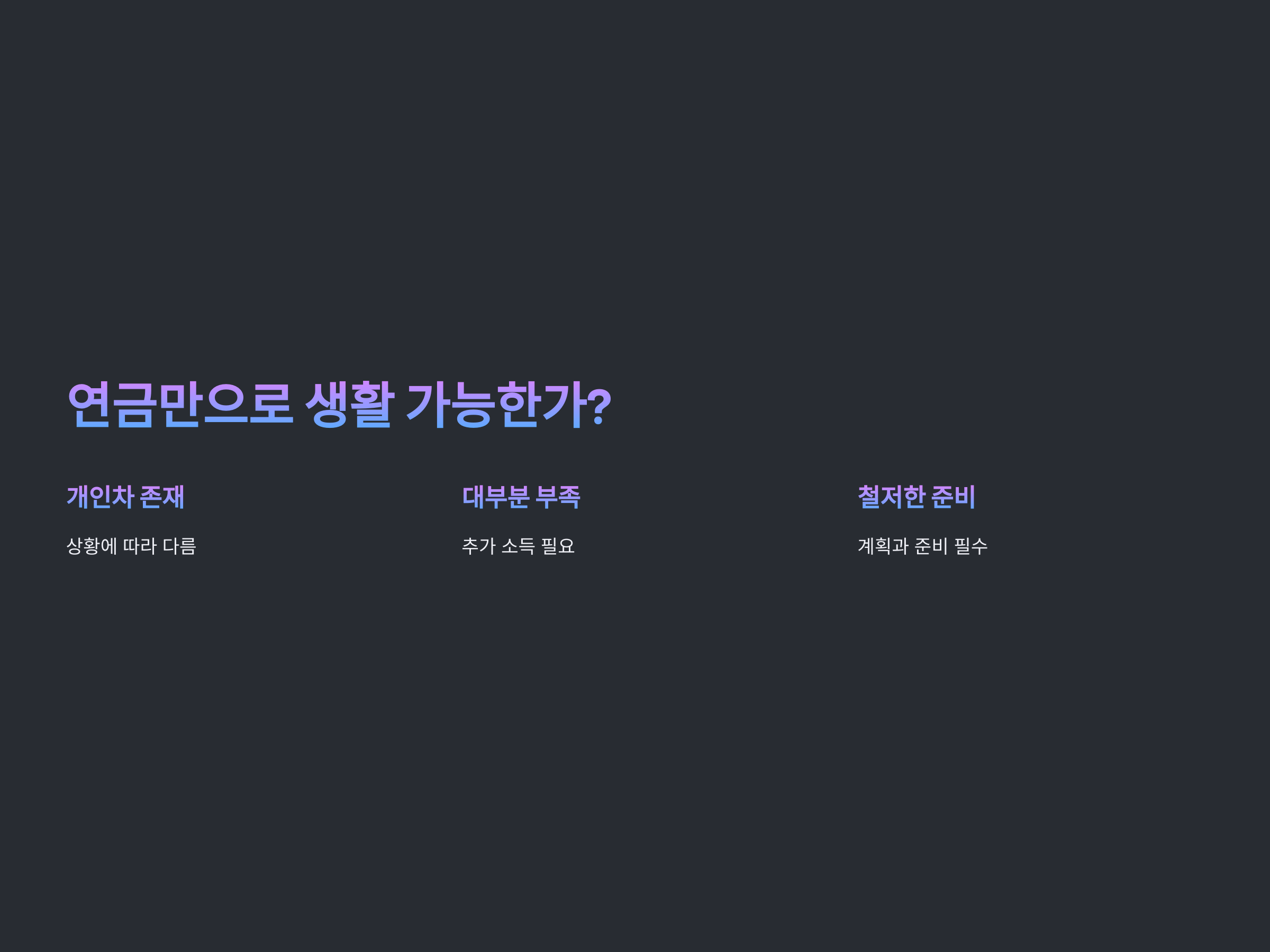 연금은 노후를 준비하는 중요한 요소이지만, 연금만으로 충분한 생활을 유지하려면 철저한 계획과 준비가 필요합니다. 따라서 연금을 충분히 활용하면서도, 나만의 노후 자산을 만드는 것이 성공적인 은퇴 생활을 위해 매우 중요합니다.