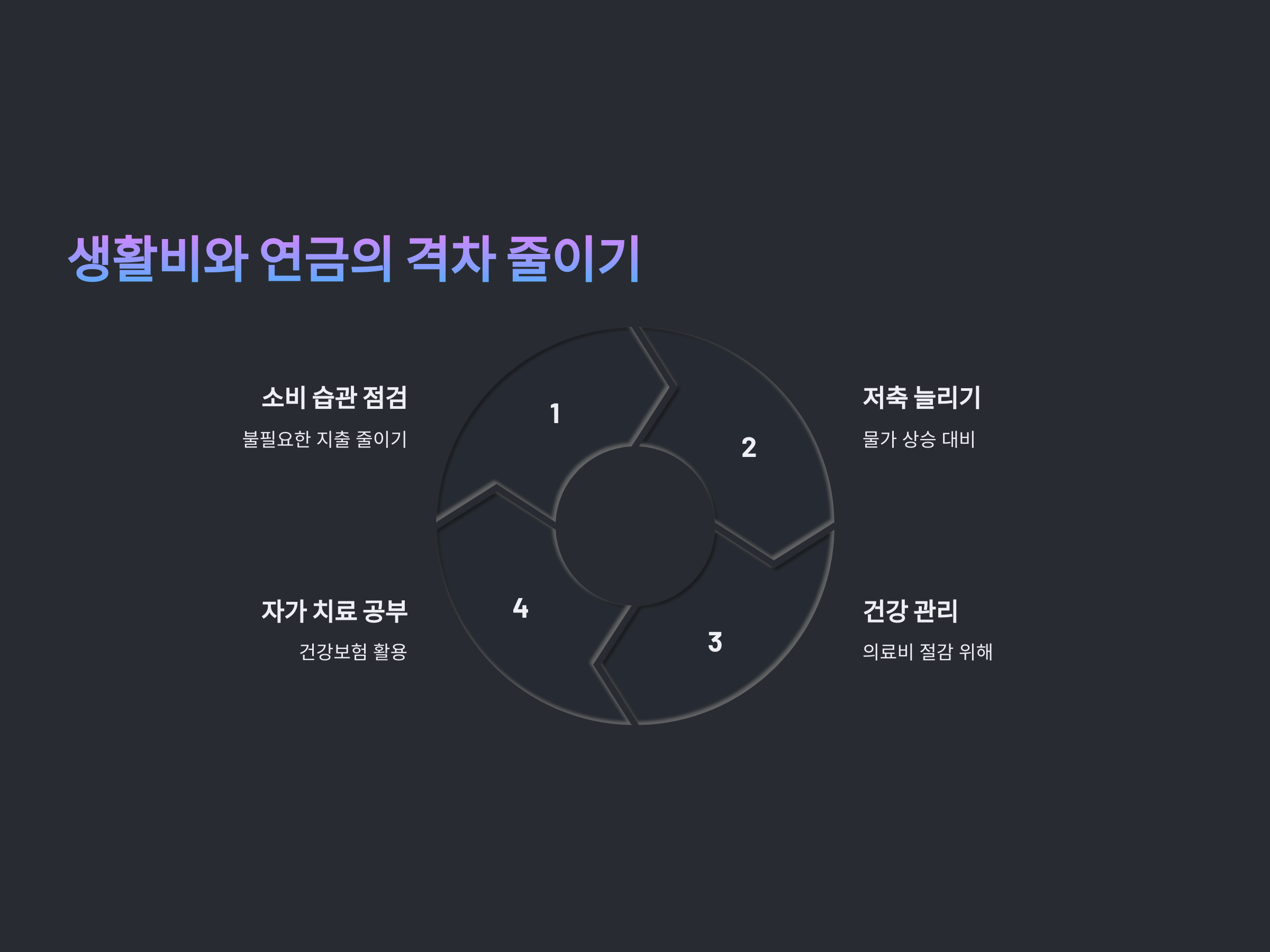 이러한 생활비 절감과 건강 관리 방법을 통해, 연금 수령액과의 차이를 줄이고 보다 안정적인 노후를 준비할 수 있습니다.
