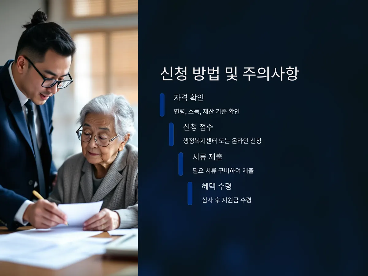 이 제도는 국민연금 수령 여부와 무관하게 신청할 수 있으며, 신청은 주소지 읍면동 행정복지센터 또는 복지로 웹사이트에서 가능합니다. 수급 대상 여부는 소득인정액 기준으로 결정되며, 재산과 금융소득, 부양 의무자 유무 등이 반영됩니다.
