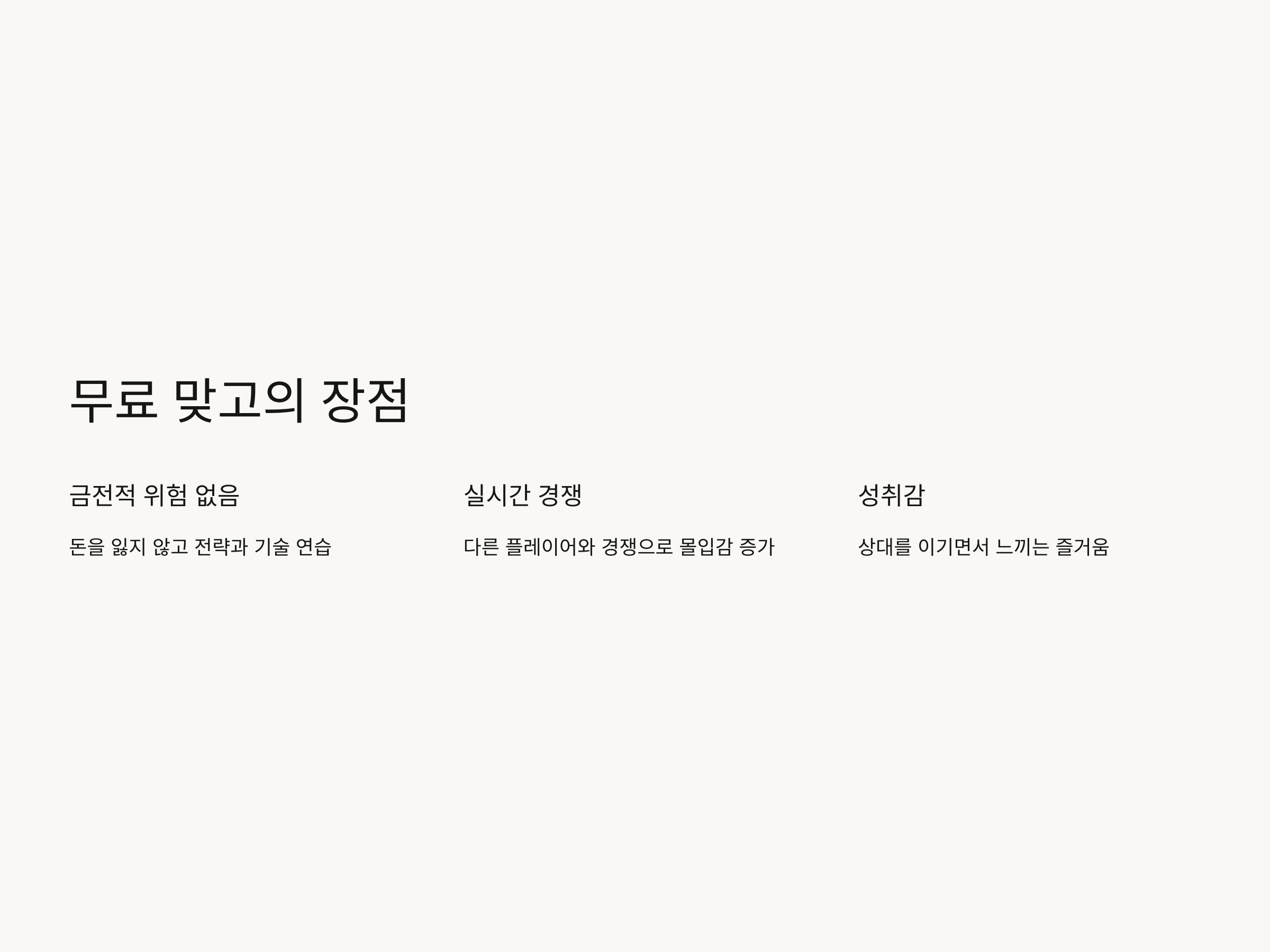 무료 맞고 게임을 즐기는 가장 큰 장점 중 하나는 돈을 잃지 않는다는 점입니다. 맞고는 주로 돈을 걸고 진행되는 게임이지만, 온라인에서 제공되는 무료 버전은 금전적 위험 없이 전략과 기술을 연습할 수 있는 기회를 제공합니다. 게임의 규칙이나 전략을 배우는 데 집중할 수 있기 때문에, 초보자에게도 매우 유익한 방식입니다.
