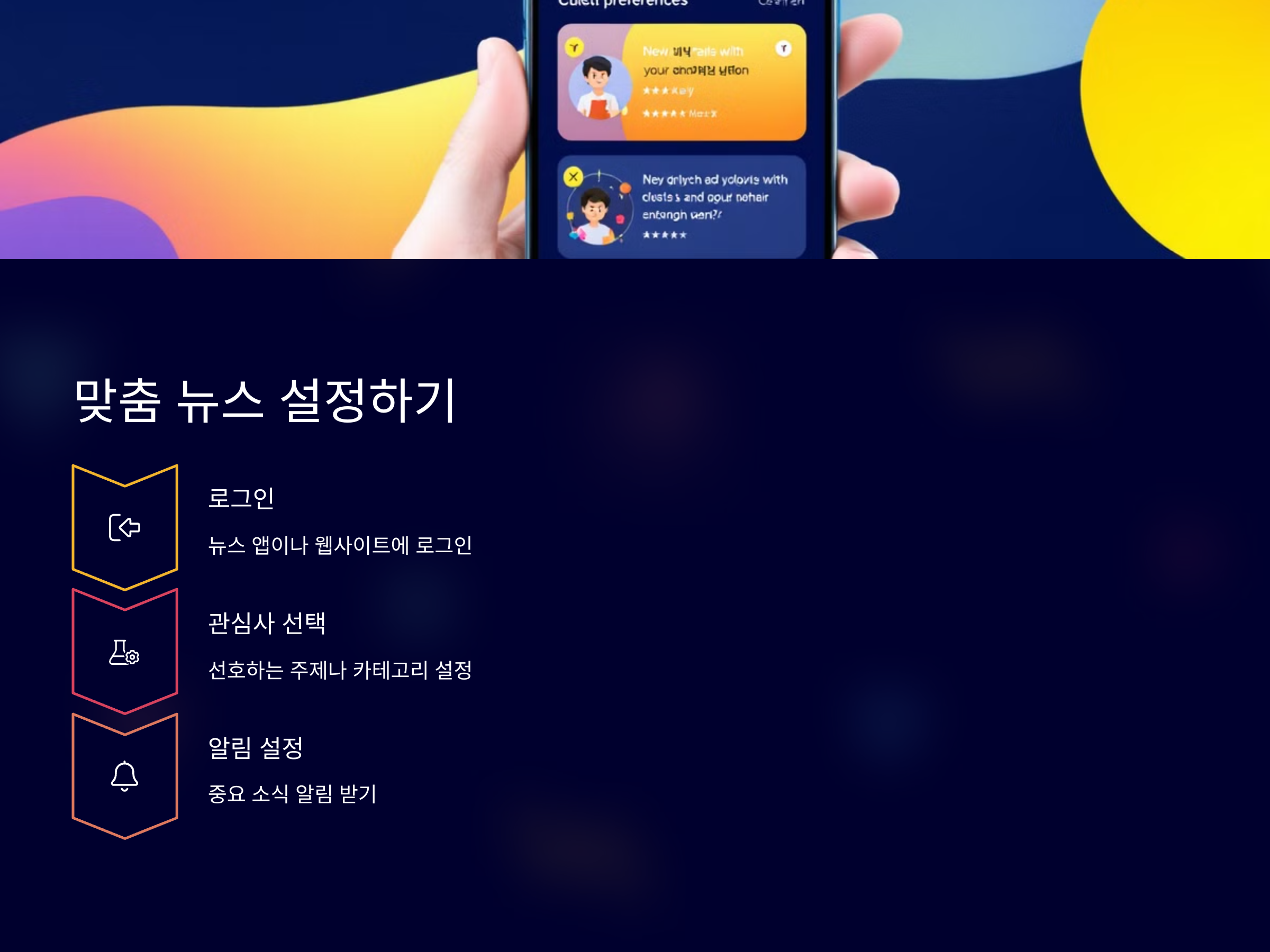 맞춤형 뉴스 설정을 통해 관심 있는 뉴스만 선별해서 볼 수 있습니다. 정치, 경제, 사회 등 여러 카테고리 중에서 자신이 선호하는 카테고리만 선택하여 구독하면, 필요한 정보만 얻을 수 있어 매우 효율적입니다. 이를 통해 더욱 집중적으로 뉴스를 소비할 수 있습니다.