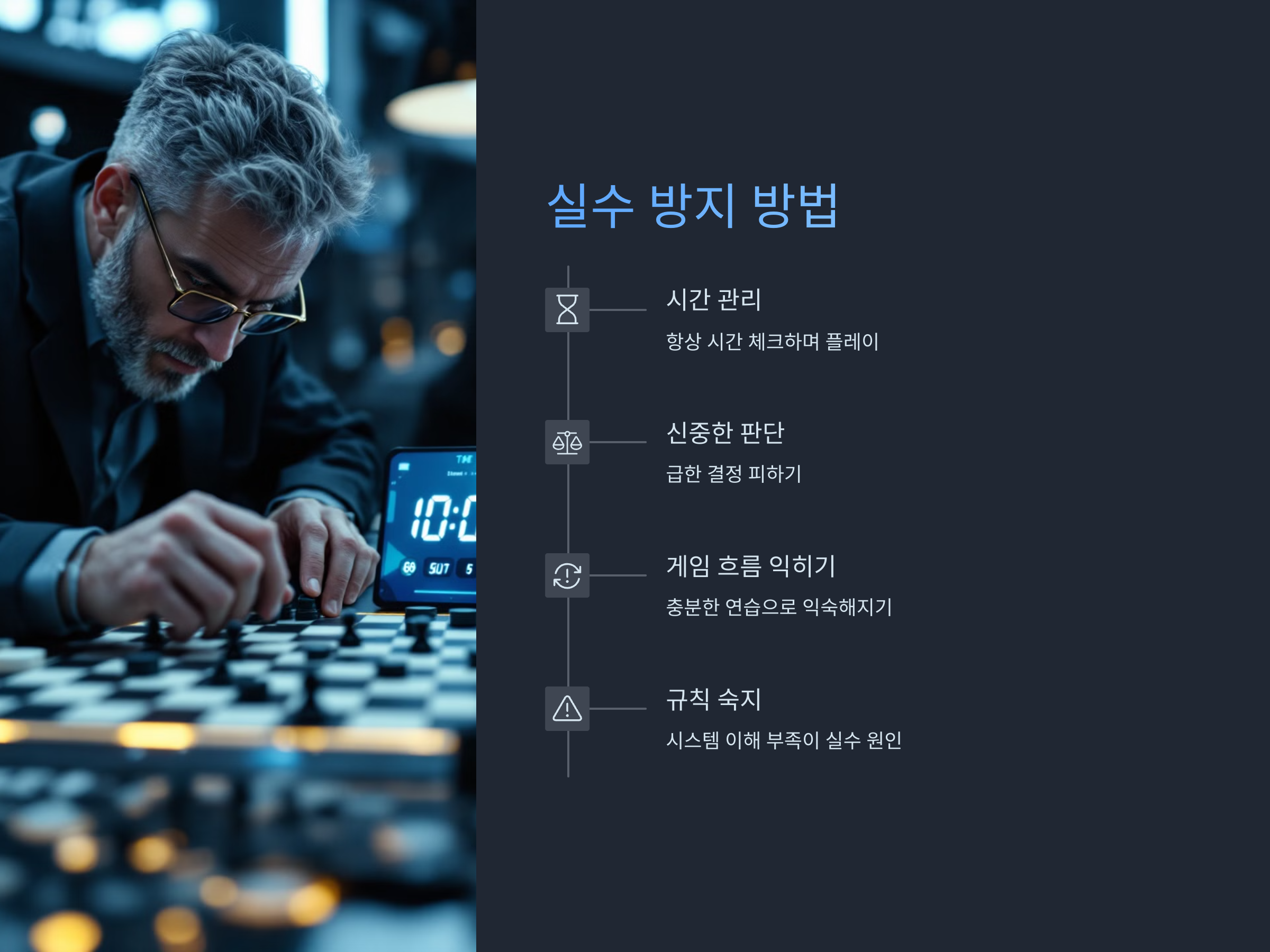 대회 중에는 긴장으로 인해 실수를 할 수 있습니다. 이런 실수를 방지하려면 먼저 시간 관리가 중요합니다. 게임을 할 때는 항상 시간을 체크하고, 빠른 판단을 내리되 신중하게 행동해야 합니다. 너무 급하게 결정을 내리면 실수를 초래할 수 있으므로, 여유를 가지며 플레이하는 것이 필요합니다.