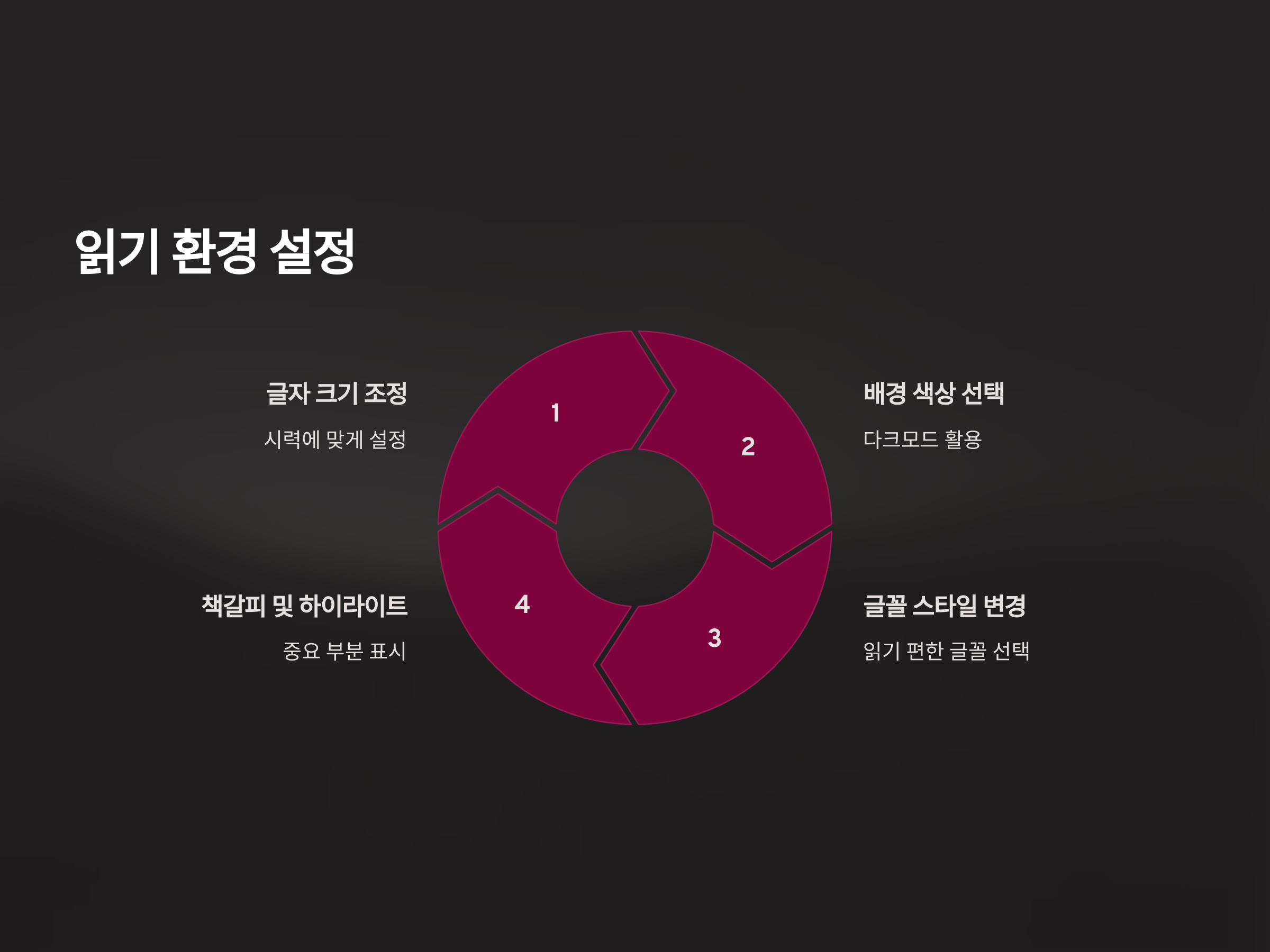 - 글자 크기 및 간격 조정: 자신의 시력에 맞게 글자 크기나 간격을 조정하여 읽기 편한 환경을 만듭니다.