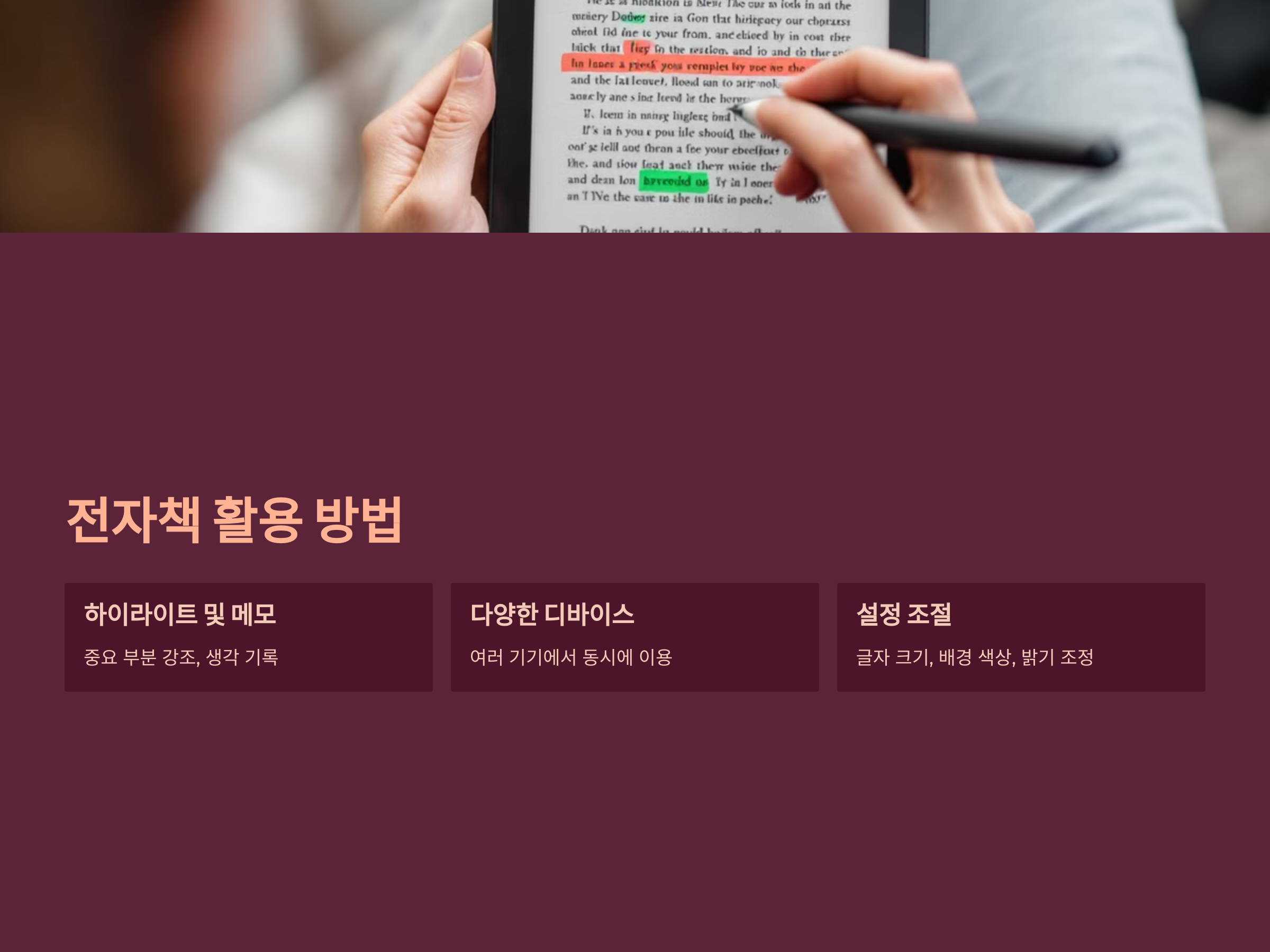 - 다양한 디바이스에서 읽기: 전자책은 여러 디바이스에서 동시에 열 수 있습니다. 예를 들어, 스마트폰에서 책을 읽다가, 태블릿에서 이어서 읽을 수 있어 편리합니다.