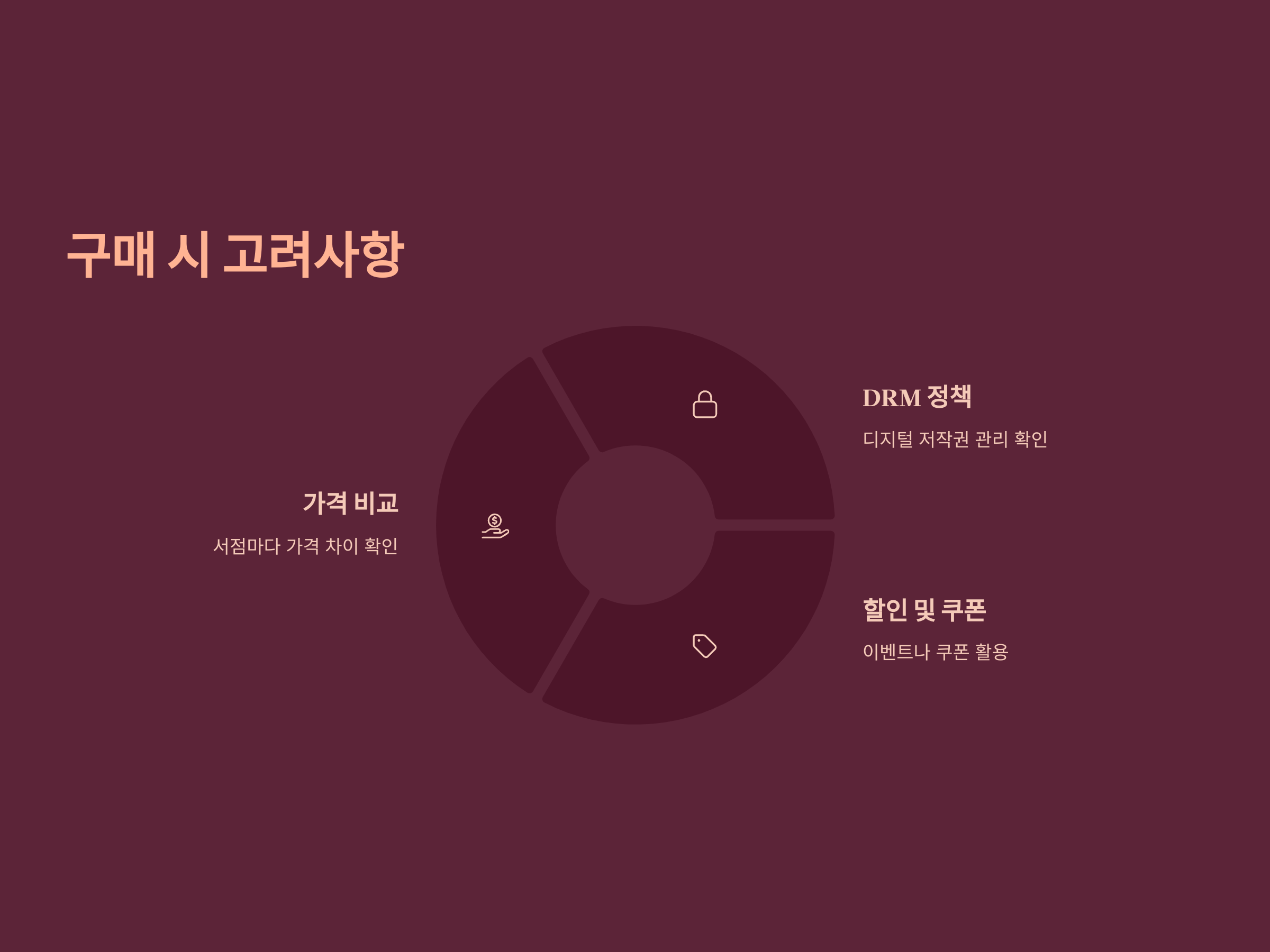 전자책을 구매할 때 가격은 물론, 책의 포맷, DRM(디지털 저작권 관리) 정책 등을 고려하는 것이 중요합니다. 일부 전자책에는 DRM이 적용되어 있어 특정 기기에서만 읽을 수 있기 때문에, 구매 전에 해당 전자책이 원하는 기기에서 읽을 수 있는지 확인하는 것이 필요합니다.