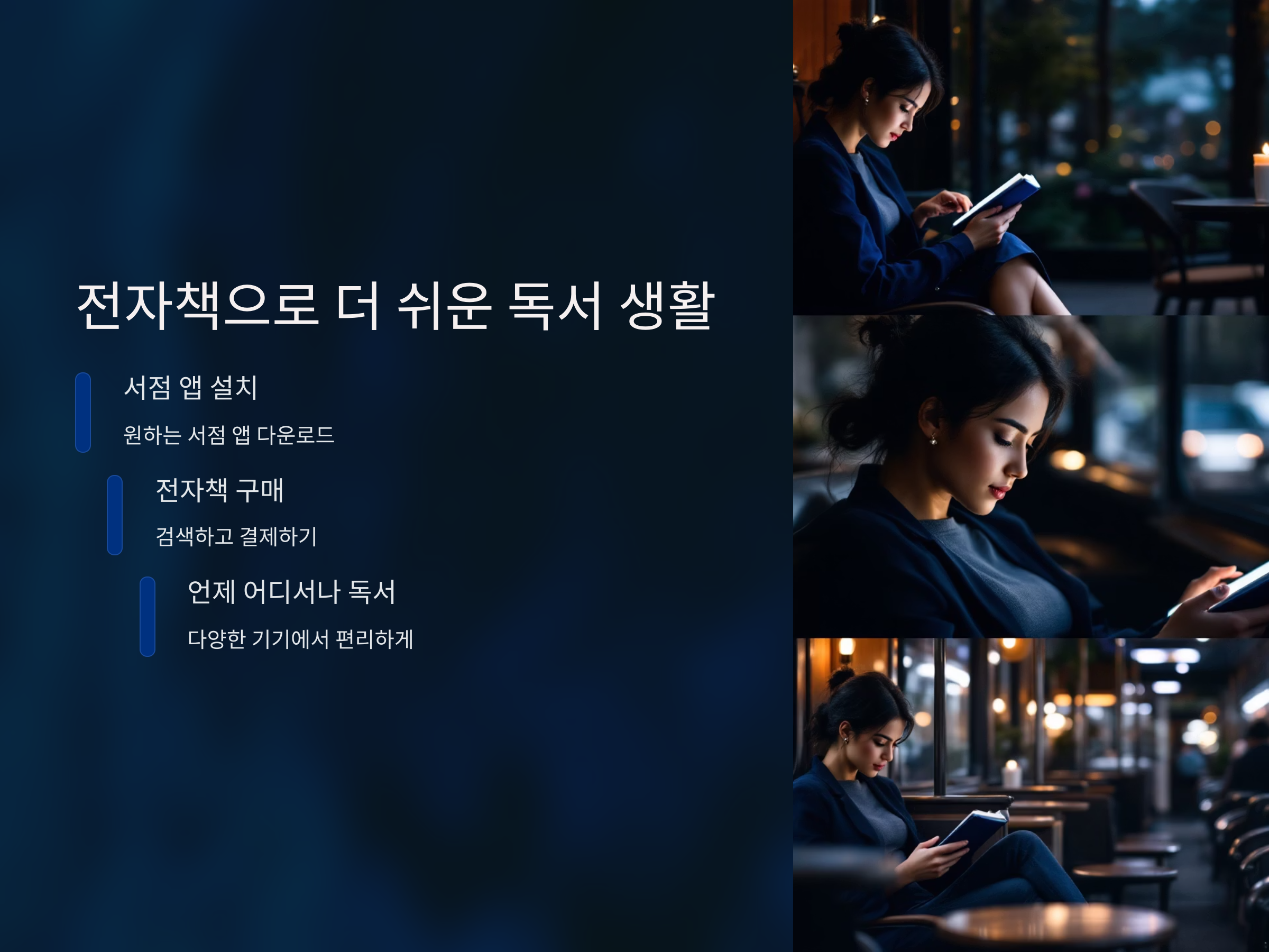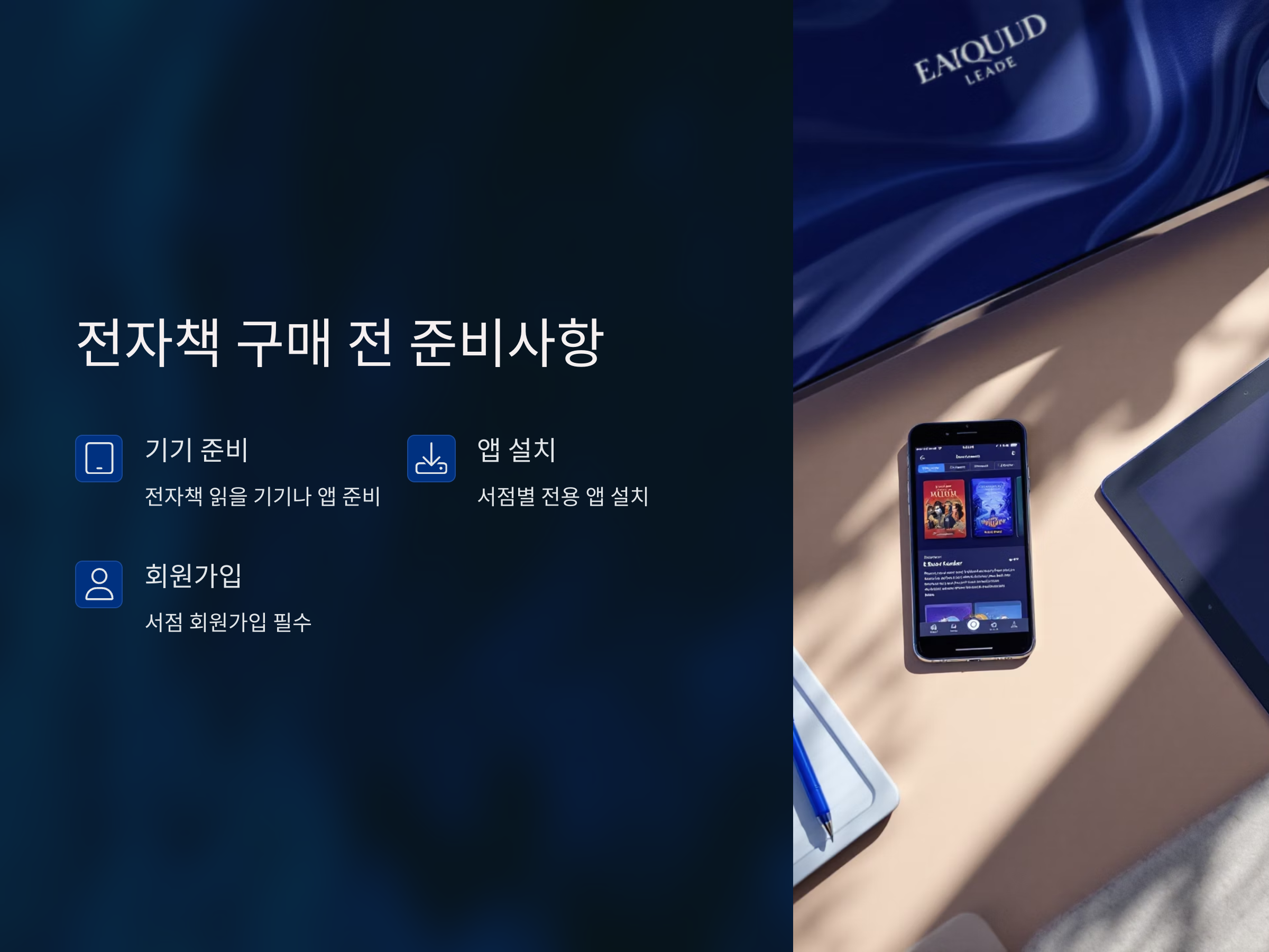 - 읽기 시작: 결제가 완료되면, 구매한 전자책은 바로 다운로드가 가능하고, 서점의 전용 앱을 통해 읽을 수 있습니다.