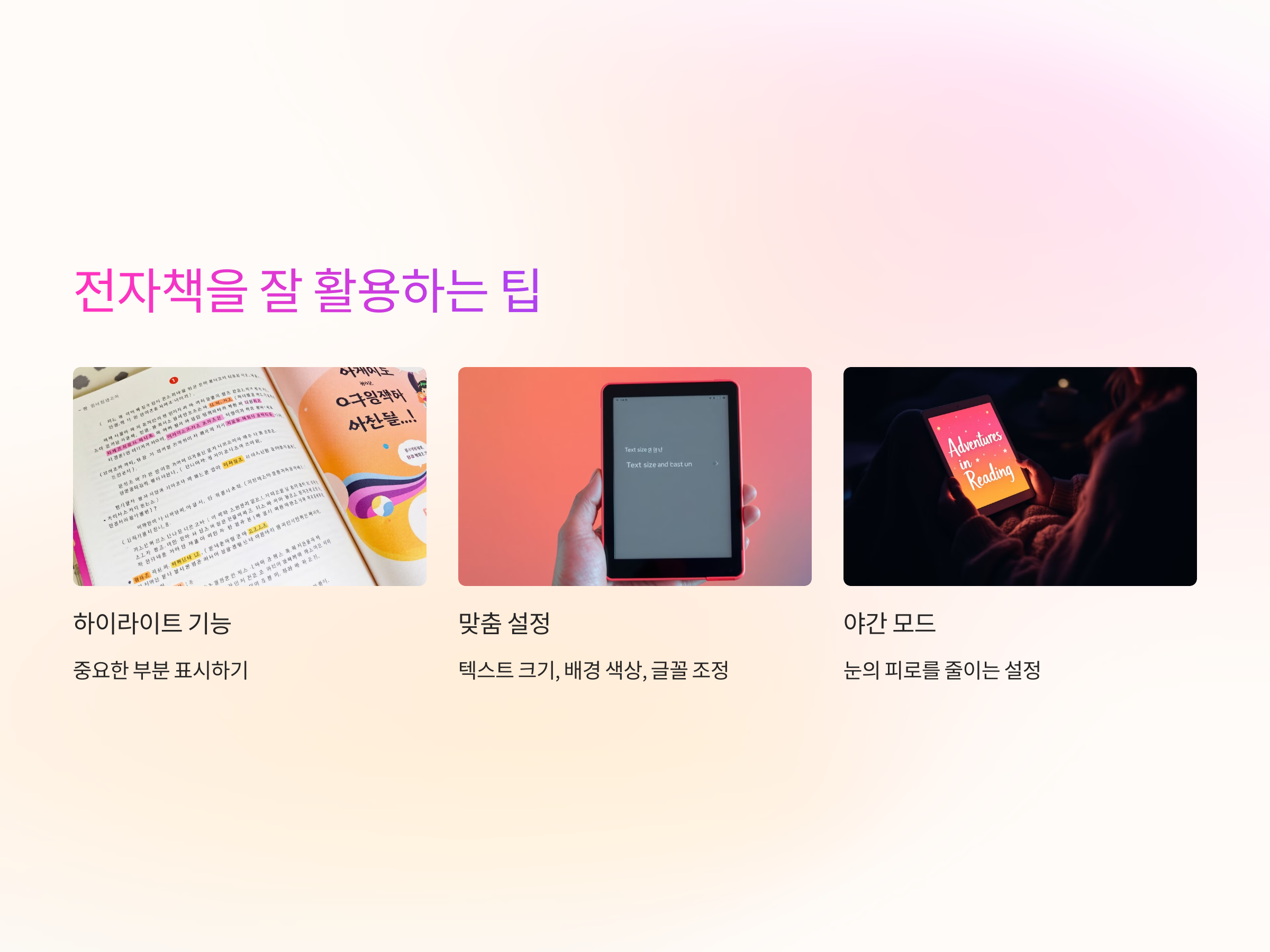 전자책을 잘 활용하려면 단순히 구매하고 읽는 것 이상의 방법이 있습니다. 예를 들어, 전자책에서는 하이라이트 기능이나 노트 기능을 활용하여 책의 중요한 부분을 표시하거나, 내가 기억하고 싶은 내용을 기록할 수 있습니다. 또한, 전자책 리더의 텍스트 크기, 배경 색상, 글꼴 등을 조정하여 눈에 더 편안하게 읽을 수 있는 환경을 만드는 것이 중요합니다. 각 서점에서는 이와 같은 맞춤 설정 기능도 지원하므로, 전자책을 좀 더 효율적으로 활용할 수 있습니다.