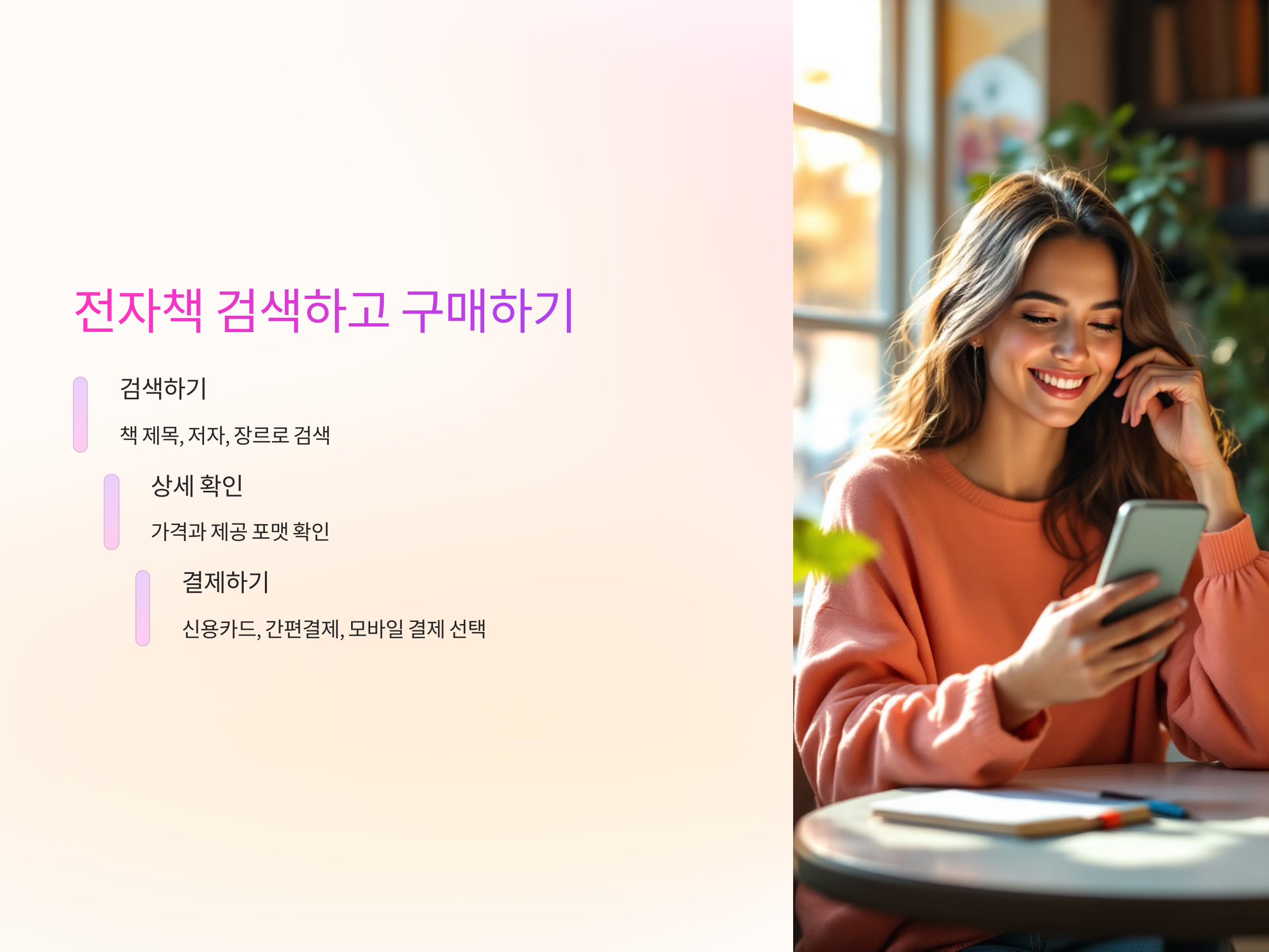 서점을 선택한 후, 원하는 전자책을 검색하는 단계입니다. 대부분의 온라인 서점은 검색 기능을 제공하고 있어 책 제목, 저자, 장르 등을 입력하여 쉽게 원하는 책을 찾을 수 있습니다. 원하는 책을 찾았다면, 책의 상세 페이지로 들어가 가격과 제공되는 포맷을 확인한 후, '구매하기' 버튼을 눌러 결제를 진행합니다. 결제는 신용카드, 간편결제, 모바일 결제 등 다양한 방법으로 이루어지며, 결제가 완료되면 전자책이 구매한 서점의 전자책 라이브러리에 추가됩니다.