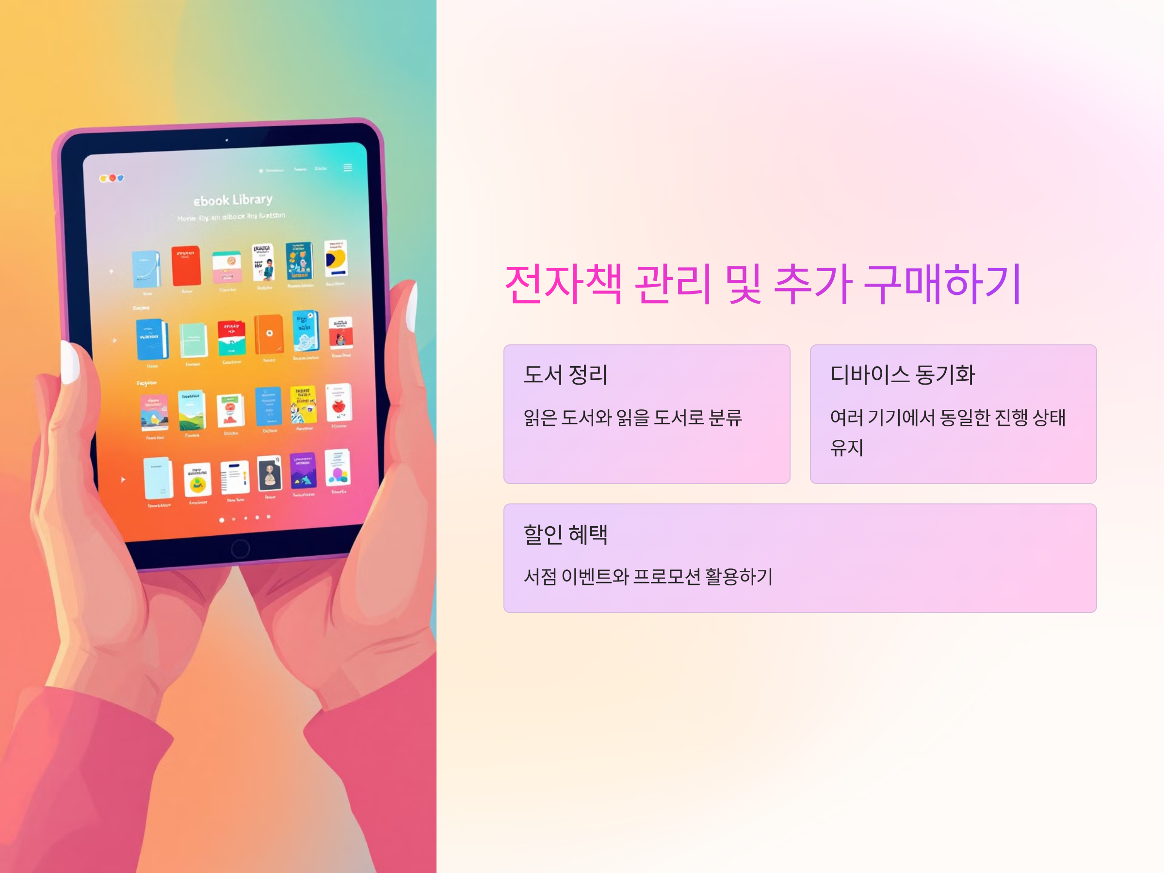 전자책을 구매한 후에도 서점의 앱에서 구매한 도서를 관리할 수 있습니다. 예를 들어, 구매한 전자책을 '읽은 도서'와 '읽을 도서'로 나누어 정리하거나, 여러 디바이스에서 동기화하여 원하는 곳에서 언제든지 읽을 수 있습니다. 또한, 새로운 전자책을 계속 구매하고 관리하기 위해 서점의 다양한 이벤트나 할인 혜택을 이용하는 것도 좋은 방법입니다.
