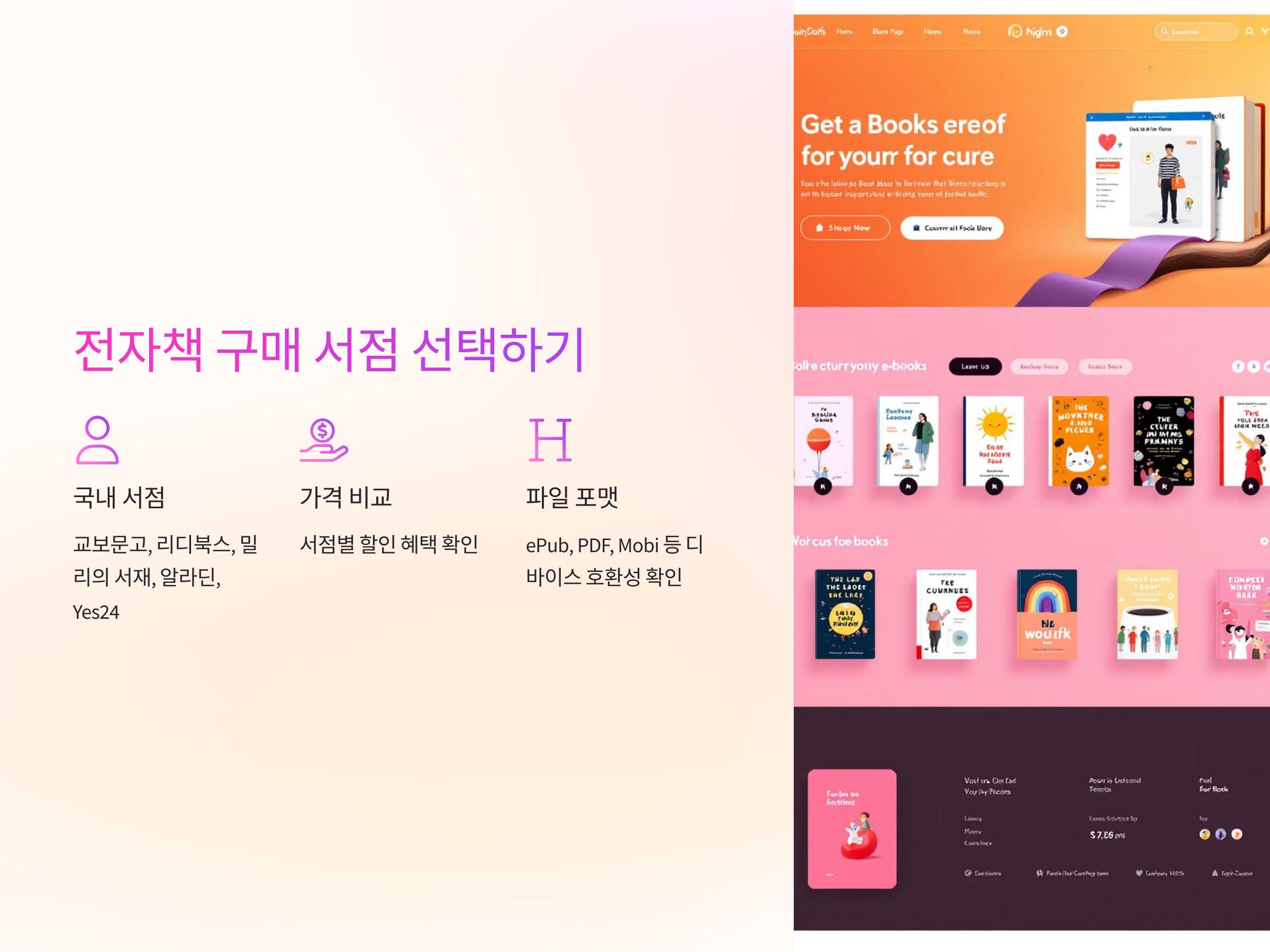 전자책을 구매하기 위해서는 먼저 구매할 서점을 선택해야 합니다. 국내에서는 교보문고, 리디북스, 밀리의 서재, 알라딘, Yes24 등 다양한 온라인 서점들이 있습니다. 각 서점마다 제공하는 전자책의 종류와 가격, 할인 혜택이 다르기 때문에 자신이 선호하는 서점을 선택하는 것이 중요합니다. 또한, 서점에 따라 전자책의 형식이 다를 수 있으므로, 자신이 사용하려는 디바이스와 호환되는 전자책 파일 포맷을 확인하는 것도 중요합니다. 대부분의 서점은 ePub, PDF, Mobi 등 다양한 포맷을 지원합니다.