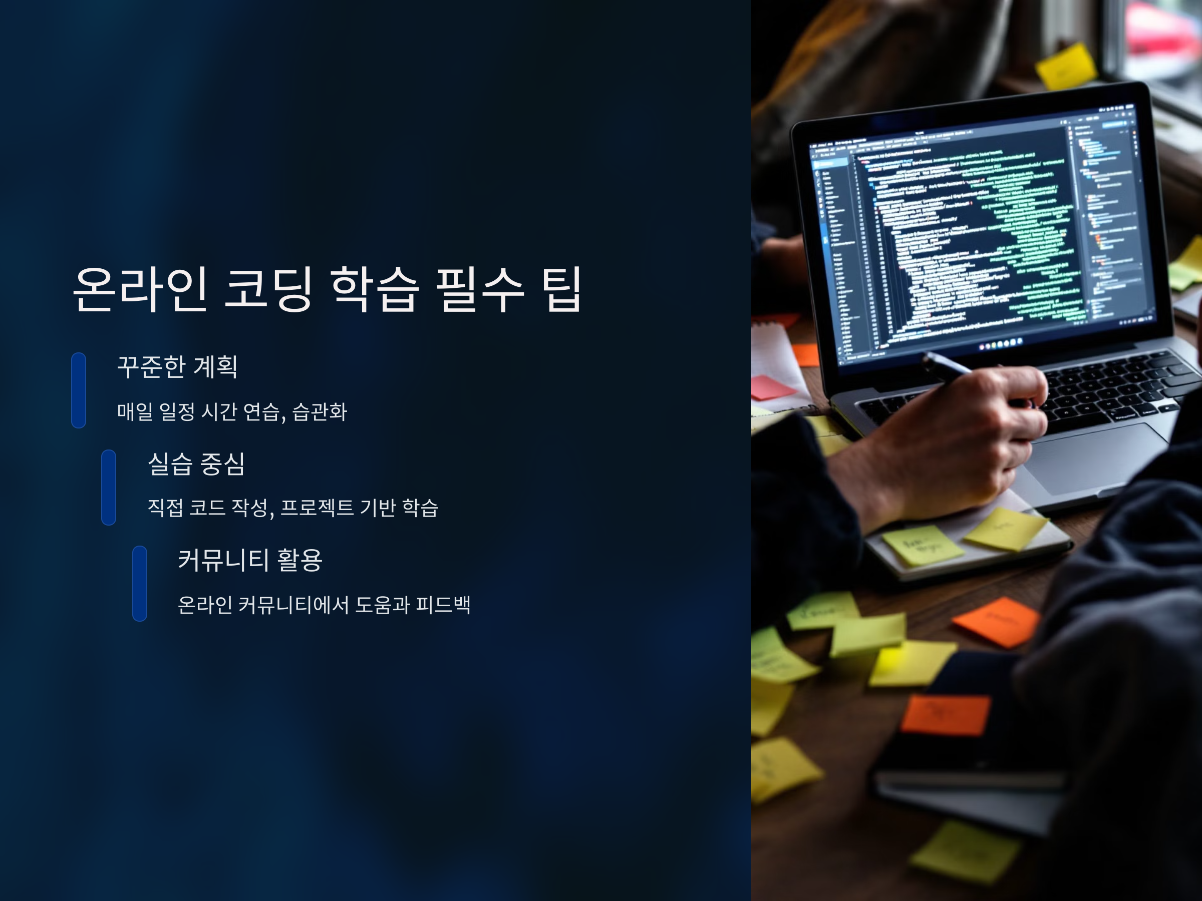 - 코딩을 배우는 과정에서 어려움을 느낀다면 온라인 커뮤니티를 적극 활용하세요.