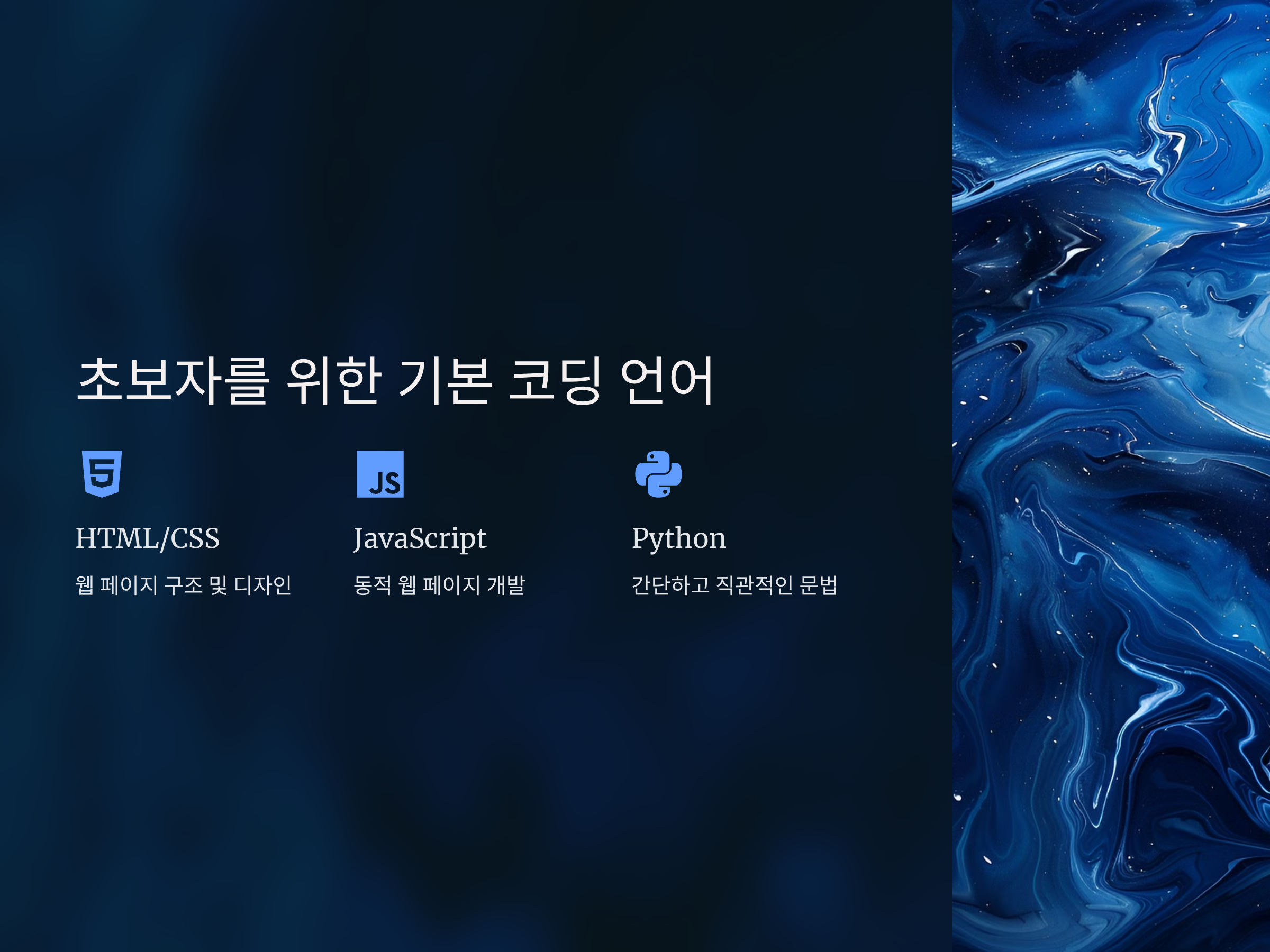- JavaScript: 웹 개발을 위한 필수 언어로, 동적인 웹 페이지를 만들 수 있습니다.