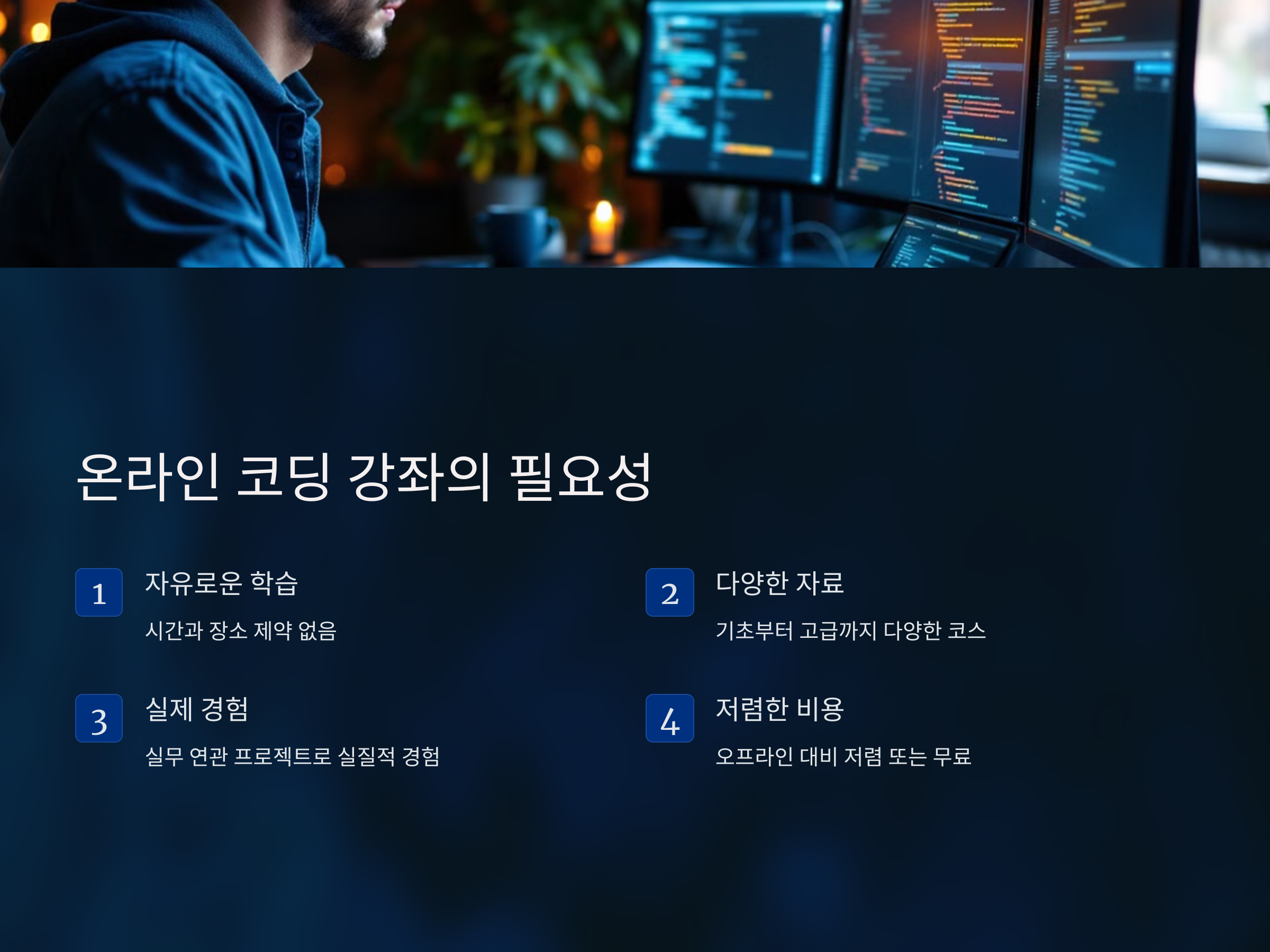 온라인 코딩 강좌를 통해 기초부터 차근차근 학습해 나가다 보면 IT 분야에서 원하는 실력을 갖출 수 있습니다. 꾸준한 실습과 프로젝트 기반 학습을 통해 실력을 키워나가세요.