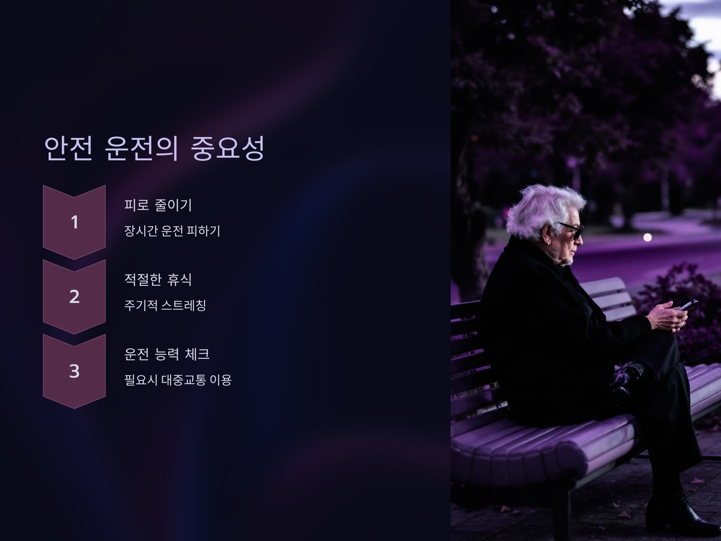 고령자는 장시간 운전을 피하고, 중간중간 쉬는 시간을 가지는 것이 좋습니다. 피로가 쌓일 경우 사고의 위험이 크게 증가할 수 있기 때문입니다.