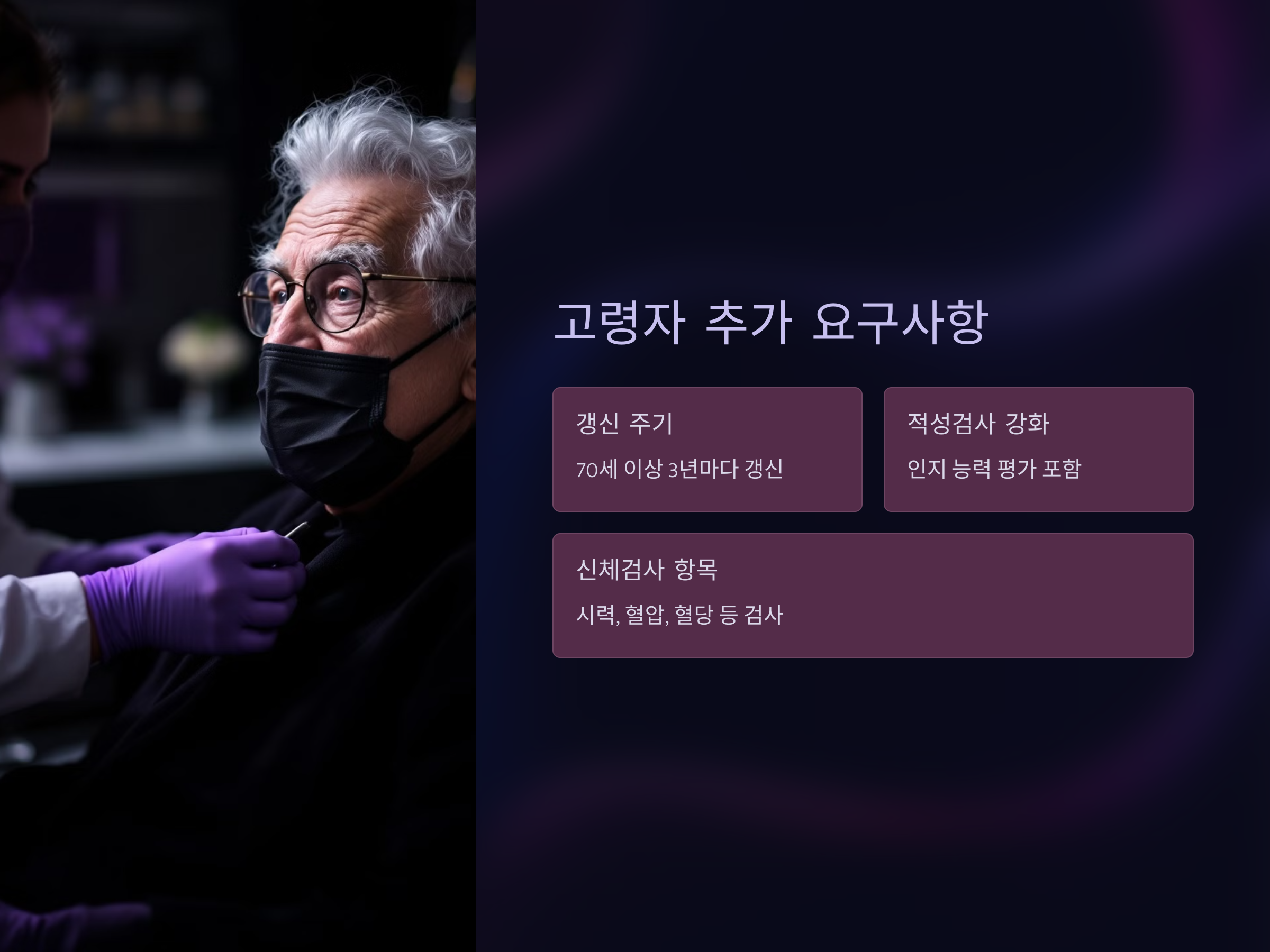 고령자의 경우 면허 갱신 절차에 몇 가지 추가적인 요구사항이 있습니다. 고령자는 특히 신체 기능이나 인지 능력의 저하가 있을 수 있기 때문에, 이에 대한 검사를 강화하고 주기적으로 갱신을 요구하는 경우가 많습니다.