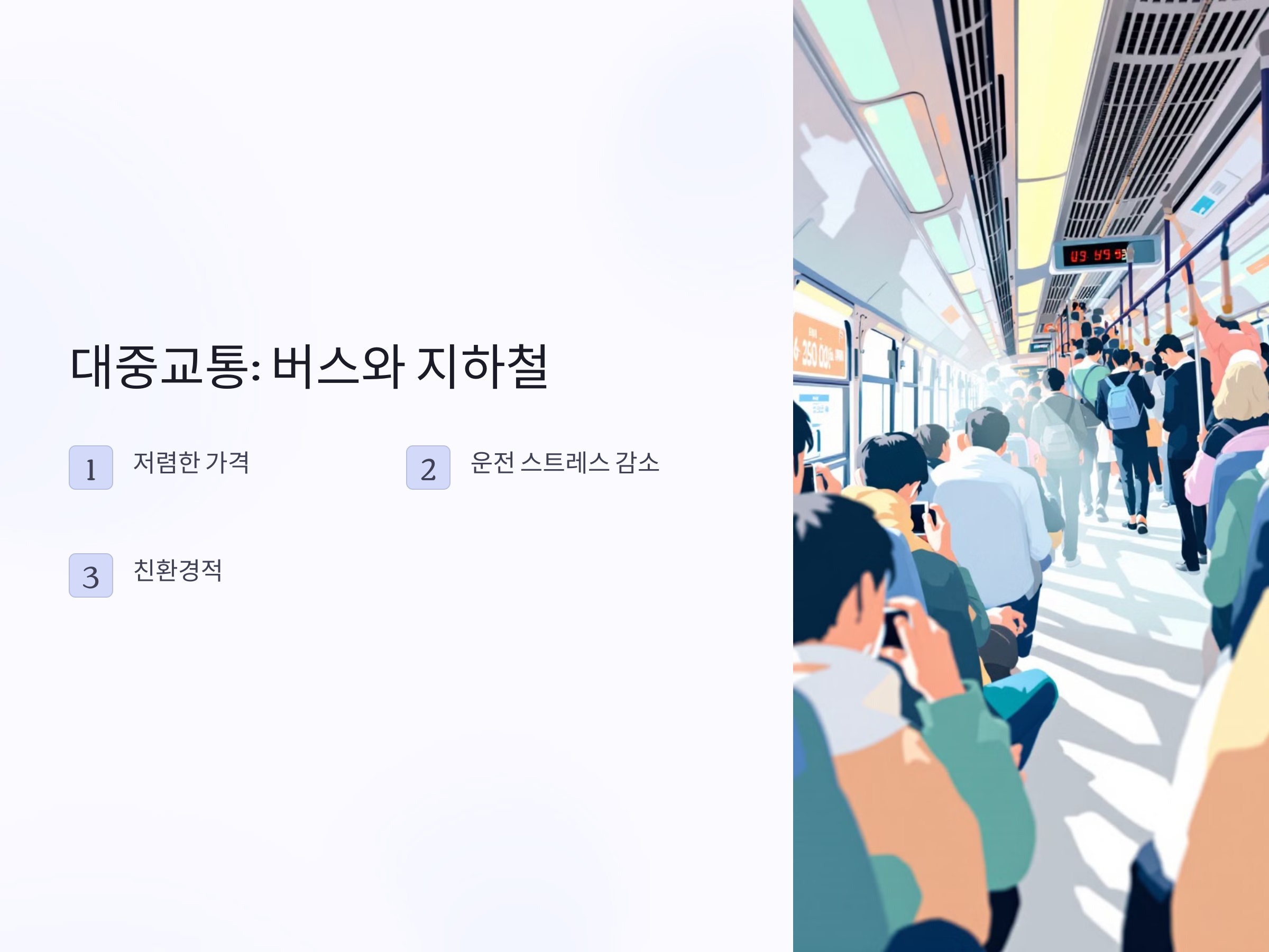 대중교통은 가장 기본적이고 널리 사용되는 교통수단입니다. 버스나 지하철은 비교적 저렴한 가격에 많은 사람들이 이용할 수 있으며, 특히 도시 내에서 이동할 때 편리합니다. 대중교통을 이용하면 운전 스트레스나 교통 체증을 피할 수 있고, 여러 사람들이 함께 이용하기 때문에 친환경적인 측면에서도 장점이 있습니다.