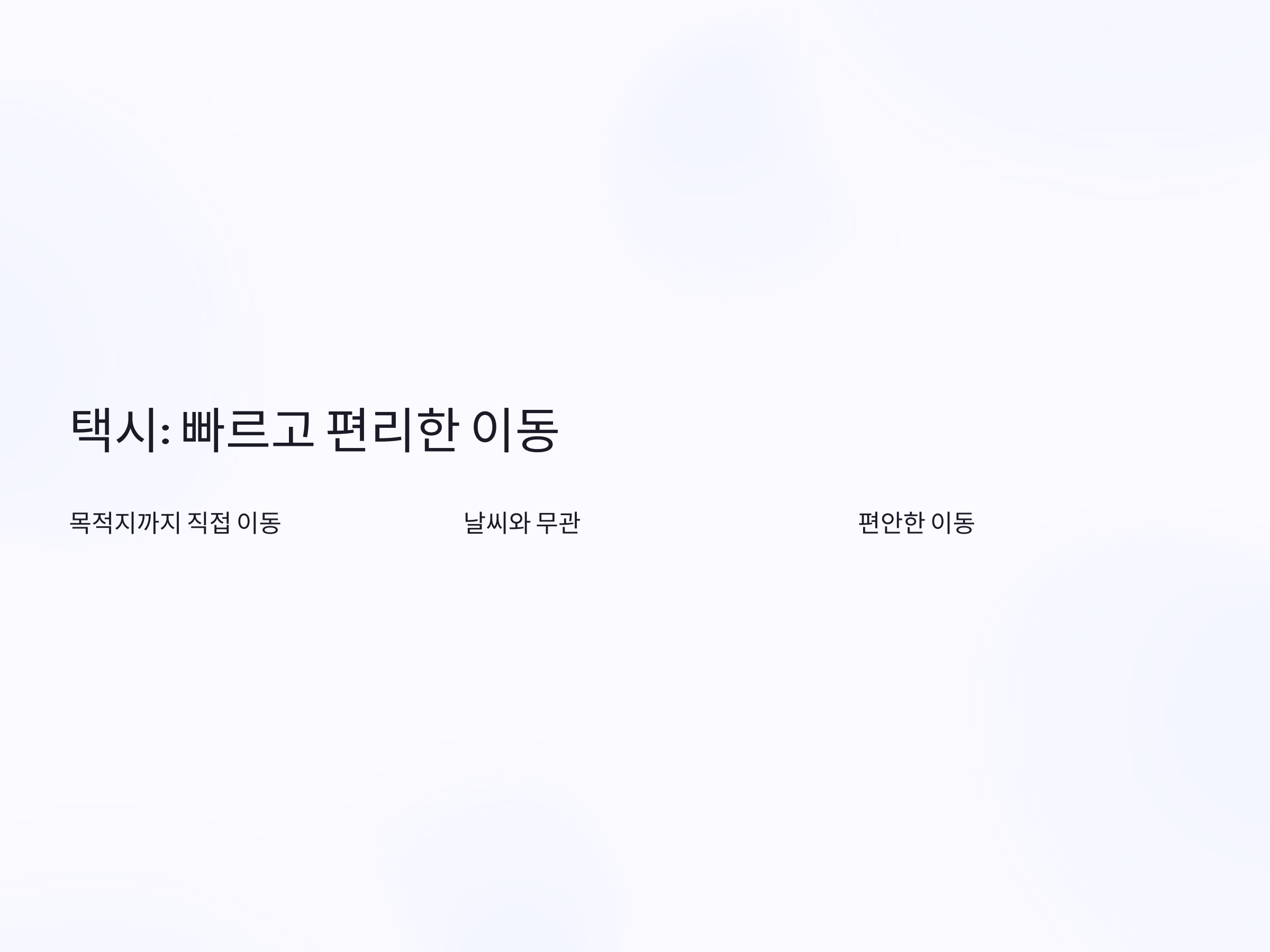 택시는 대중교통과 달리 목적지까지 바로 갈 수 있는 장점이 있습니다. 특히, 날씨나 도로 상황이 좋지 않을 때 택시는 매우 유용한 교통수단이 될 수 있습니다. 택시를 이용하면 운전의 스트레스에서 벗어나 편안하게 목적지까지 이동할 수 있습니다.