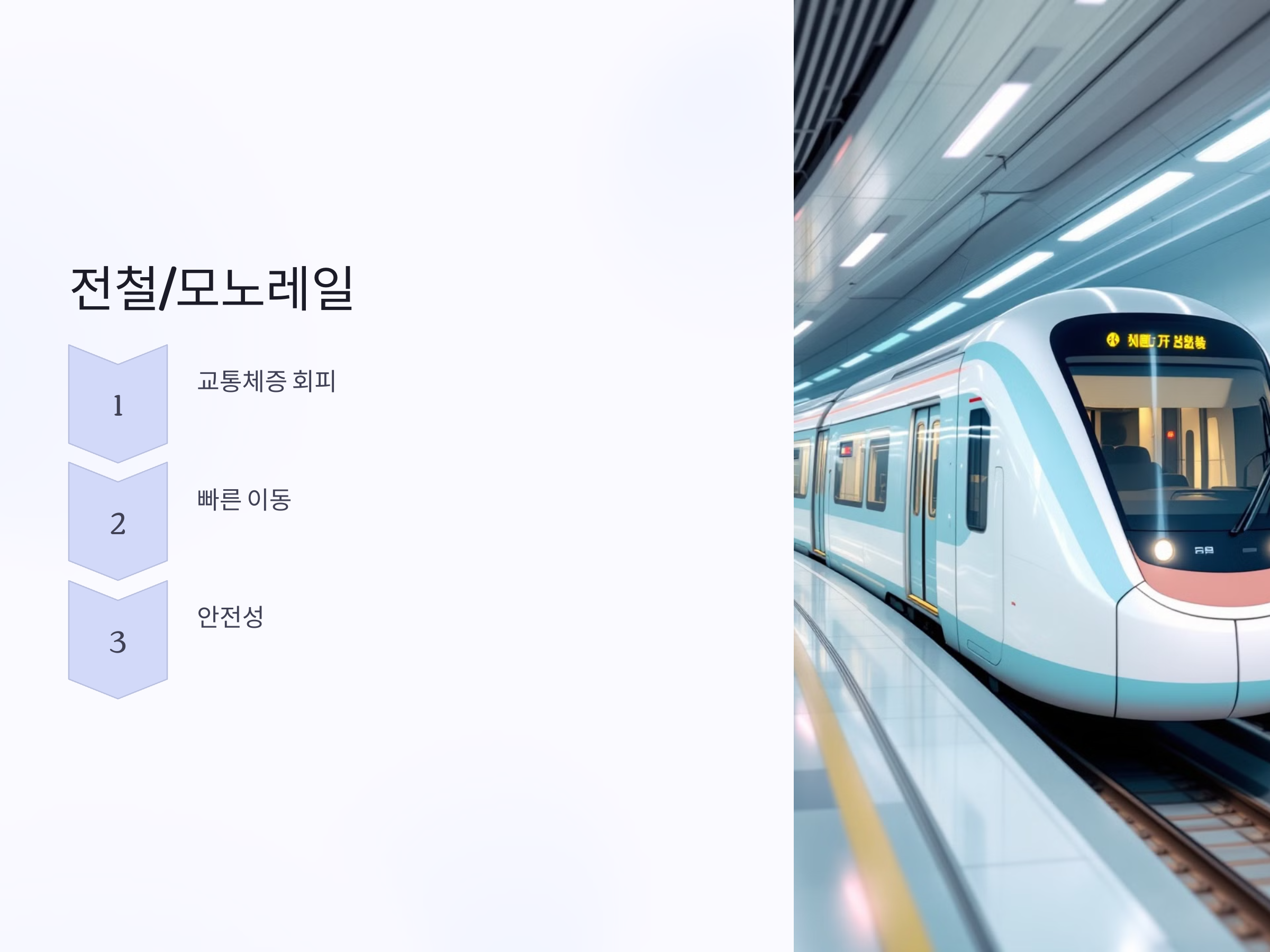 이들은 대체로 정해진 경로를 따라 운행되므로, 목적지까지 빠르고 안전하게 이동할 수 있습니다. 다만, 전철이나 모노레일을 이용할 때는 환승이 필요할 수 있고, 일부 지역에서는 노선이 부족할 수 있다는 점을 고려해야 합니다.