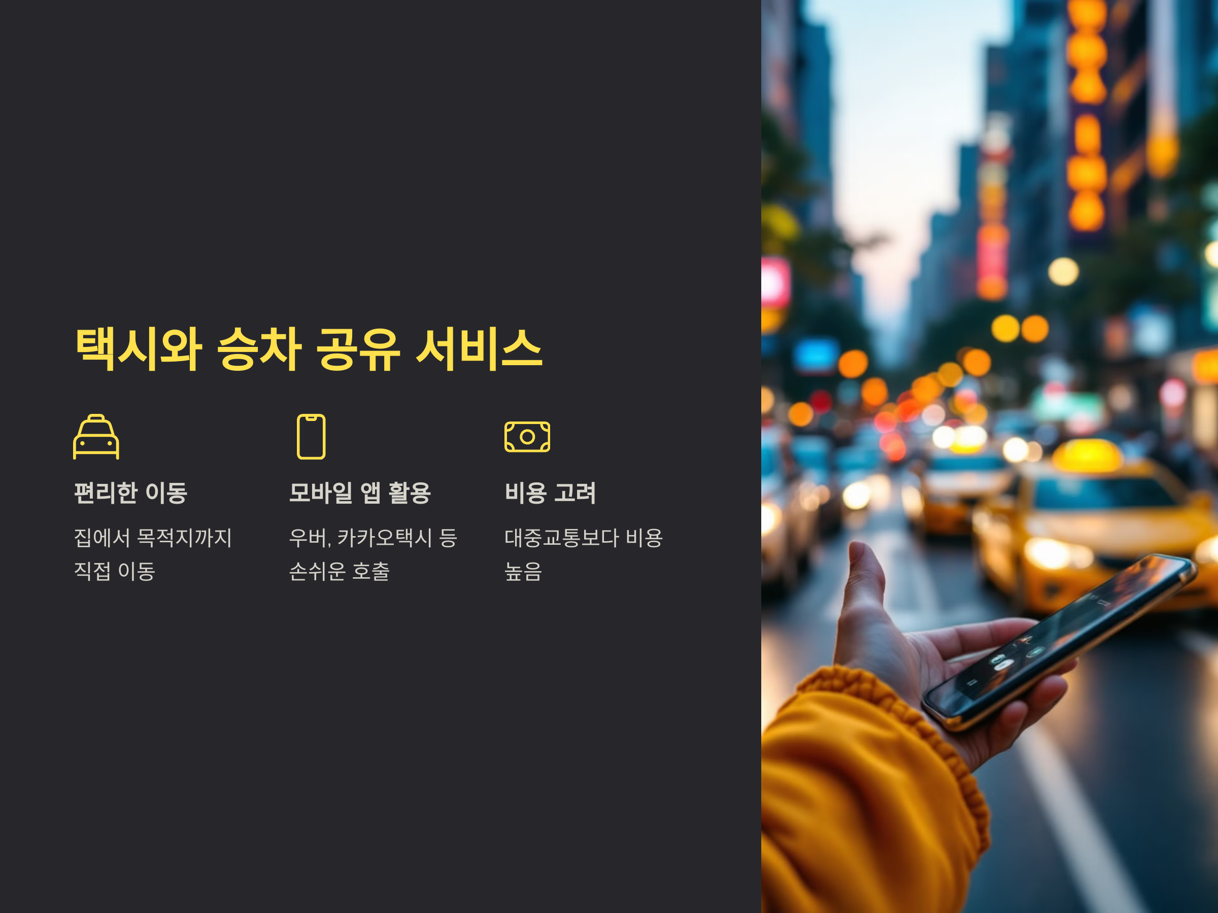 택시나 승차 공유 서비스는 이동에 편리함을 더해주는 교통수단입니다. 특히, 신체적으로 불편한 경우 택시를 이용하면 집에서 바로 목적지까지 빠르고 편리하게 이동할 수 있습니다. 승차 공유 서비스인 우버(Uber), 카카오택시 등은 모바일 앱을 통해 손쉽게 차량을 호출할 수 있어 매우 유용합니다.