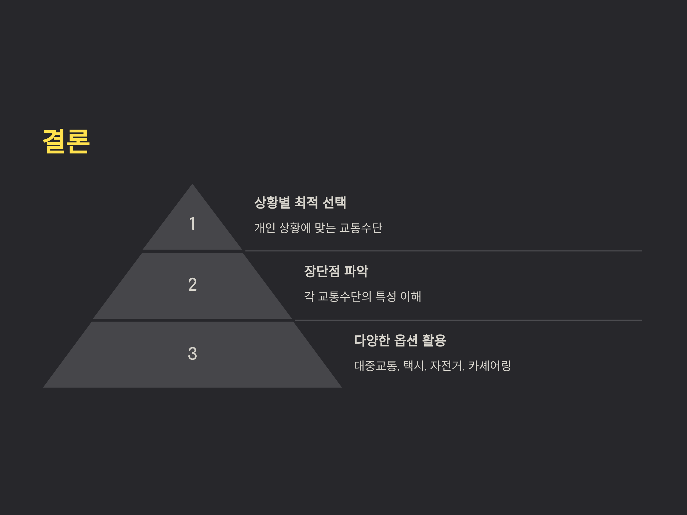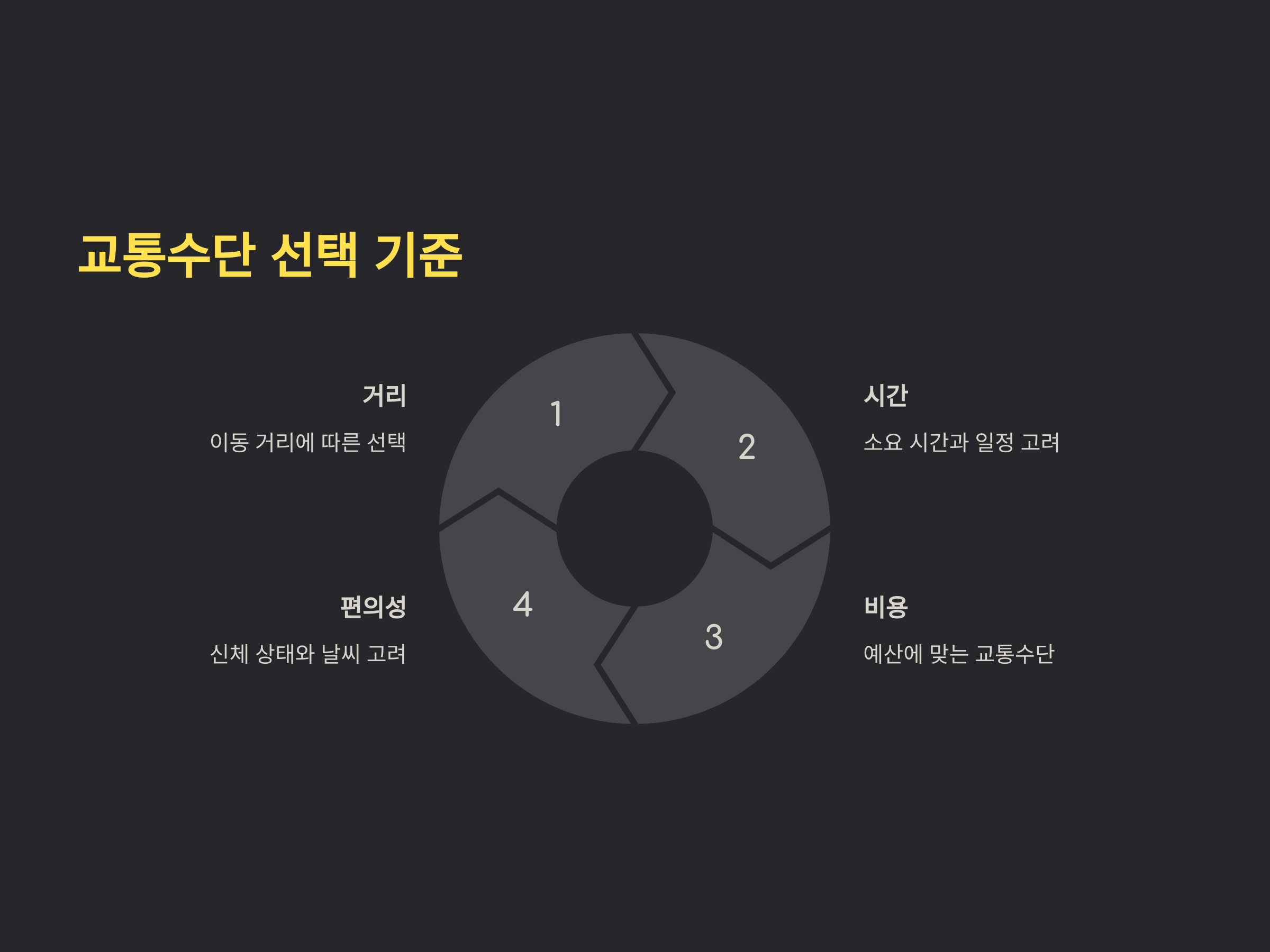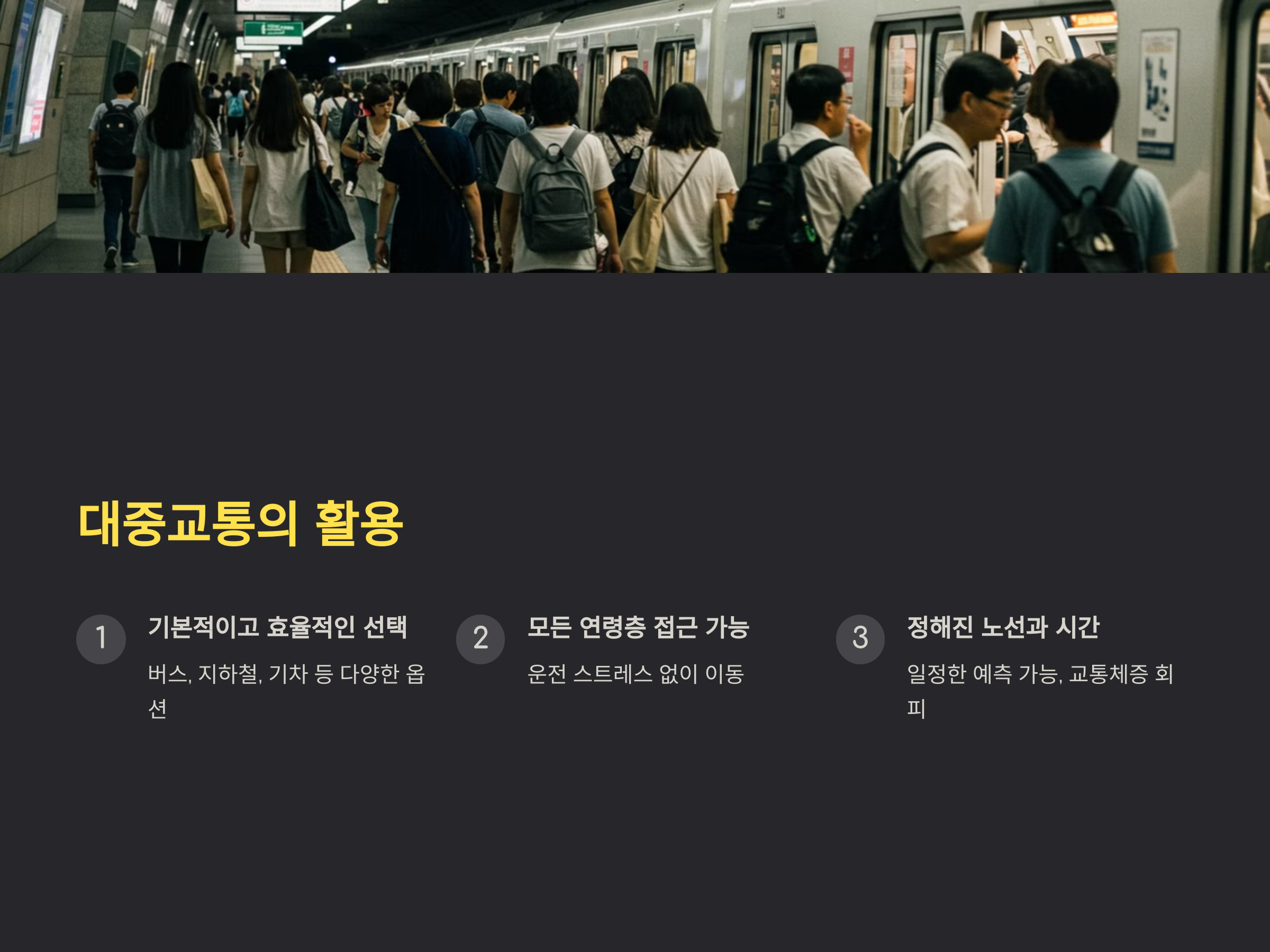 대중교통의 장점은 정해진 노선과 시간이 있기 때문에 일정한 예측이 가능하고, 교통체증을 피해 목적지에 빨리 도달할 수 있다는 점입니다. 하지만 혼잡한 시간대에는 불편할 수 있고, 목적지와 대중교통 노선이 일치하지 않는 경우가 있어 환승이나 도보 이동이 필요할 수 있습니다.