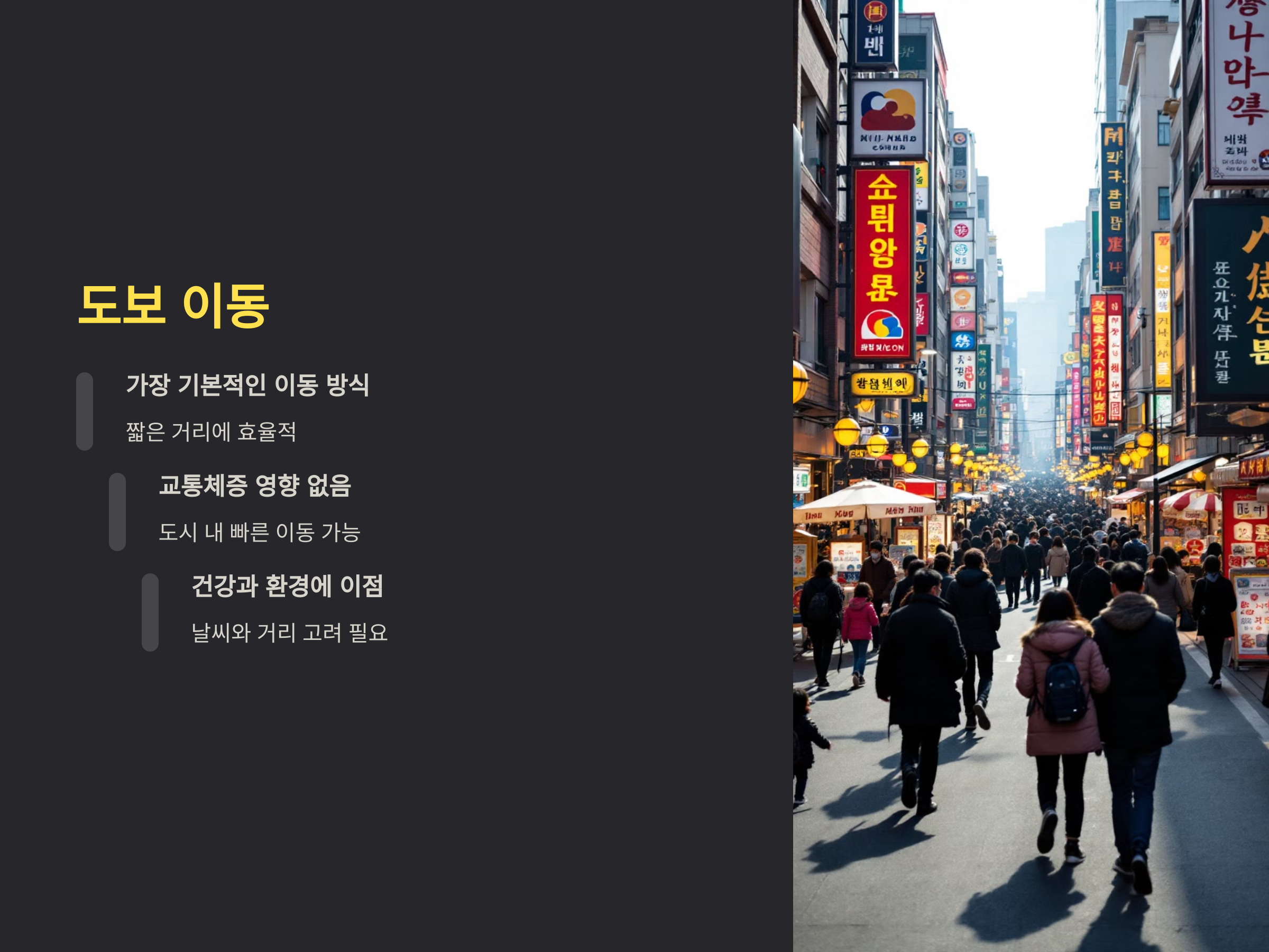 도보 이동은 가장 기본적이고 쉬운 교통수단입니다. 짧은 거리를 이동할 때는 도보가 가장 효율적일 수 있습니다. 특히, 도시 내에서는 많은 경우 도보가 가장 빠르고, 교통체증에 영향을 받지 않기 때문에 편리합니다. 또한, 건강에도 좋고 환경에 미치는 영향이 적습니다.