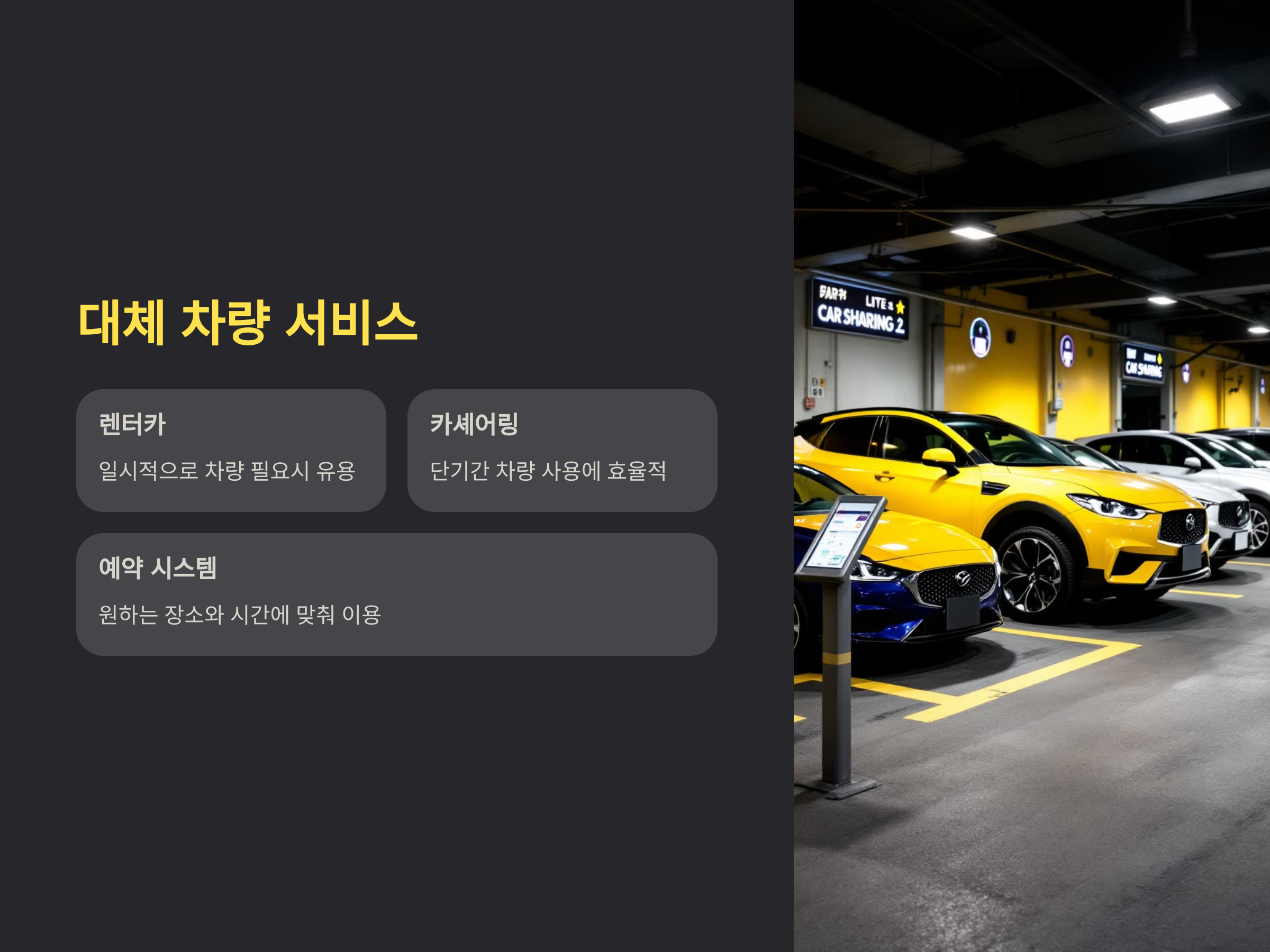 렌터카나 카셰어링 서비스는 일시적으로 차량이 필요할 때 유용한 대체 수단입니다. 운전이 어려운 경우에도 이런 서비스를 통해 차량을 대여하여 자신이 원하는 시간에 편리하게 이동할 수 있습니다. 특히, 카셰어링은 단기간 동안 차량을 사용해야 할 때 매우 효율적입니다.