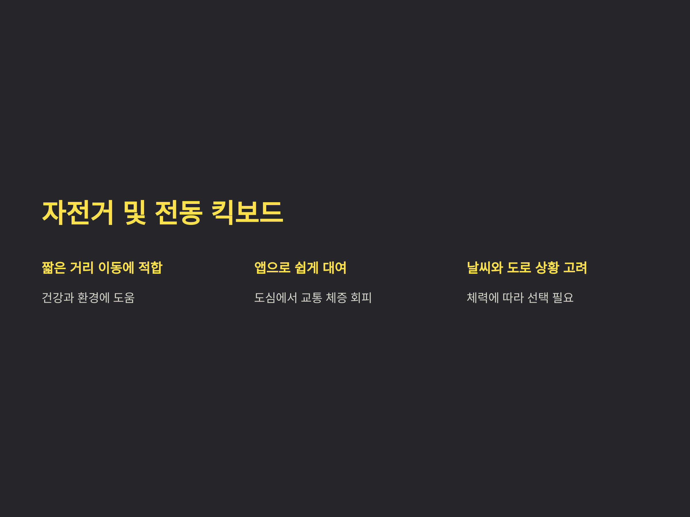 자전거와 전동 킥보드는 짧은 거리의 이동을 위한 좋은 대체 수단입니다. 특히, 자전거는 건강에도 좋고 환경에도 도움이 되며, 전동 킥보드는 매우 빠르고 효율적으로 이동할 수 있습니다. 특히 전동 킥보드는 최근 몇 년 동안 큰 인기를 끌며, 앱을 통해 쉽게 대여할 수 있습니다.