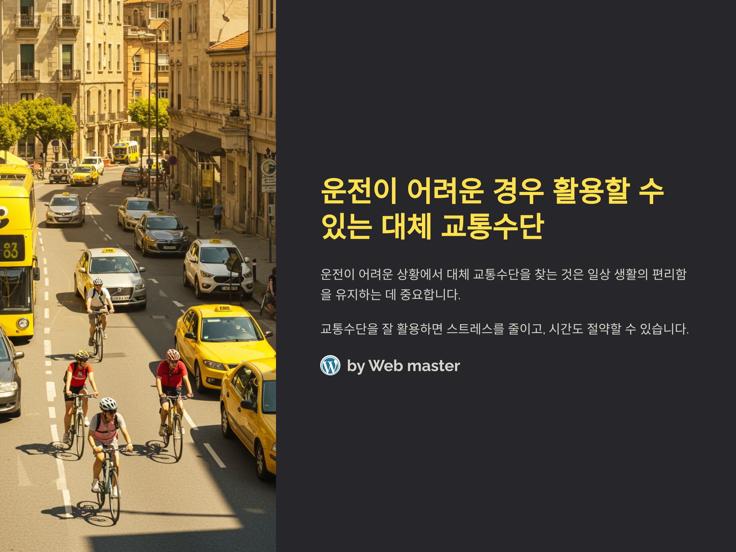 운전이 어려운 상황에서 대체 교통수단을 찾는 것은 일상 생활의 편리함을 유지하는 데 중요합니다. 교통수단을 잘 활용하면 스트레스를 줄이고, 시간도 절약할 수 있습니다. 예를 들어, 운전이 어려운 이유가 신체적 문제일 수 있으며, 그 외에도 교통 체증, 주차 문제, 혹은 환경적 이유 등 다양한 원인이 있을 수 있습니다. 이럴 때 활용할 수 있는 교통수단은 생각보다 다양하며, 그 사용 방법에 대해 알아보겠습니다.