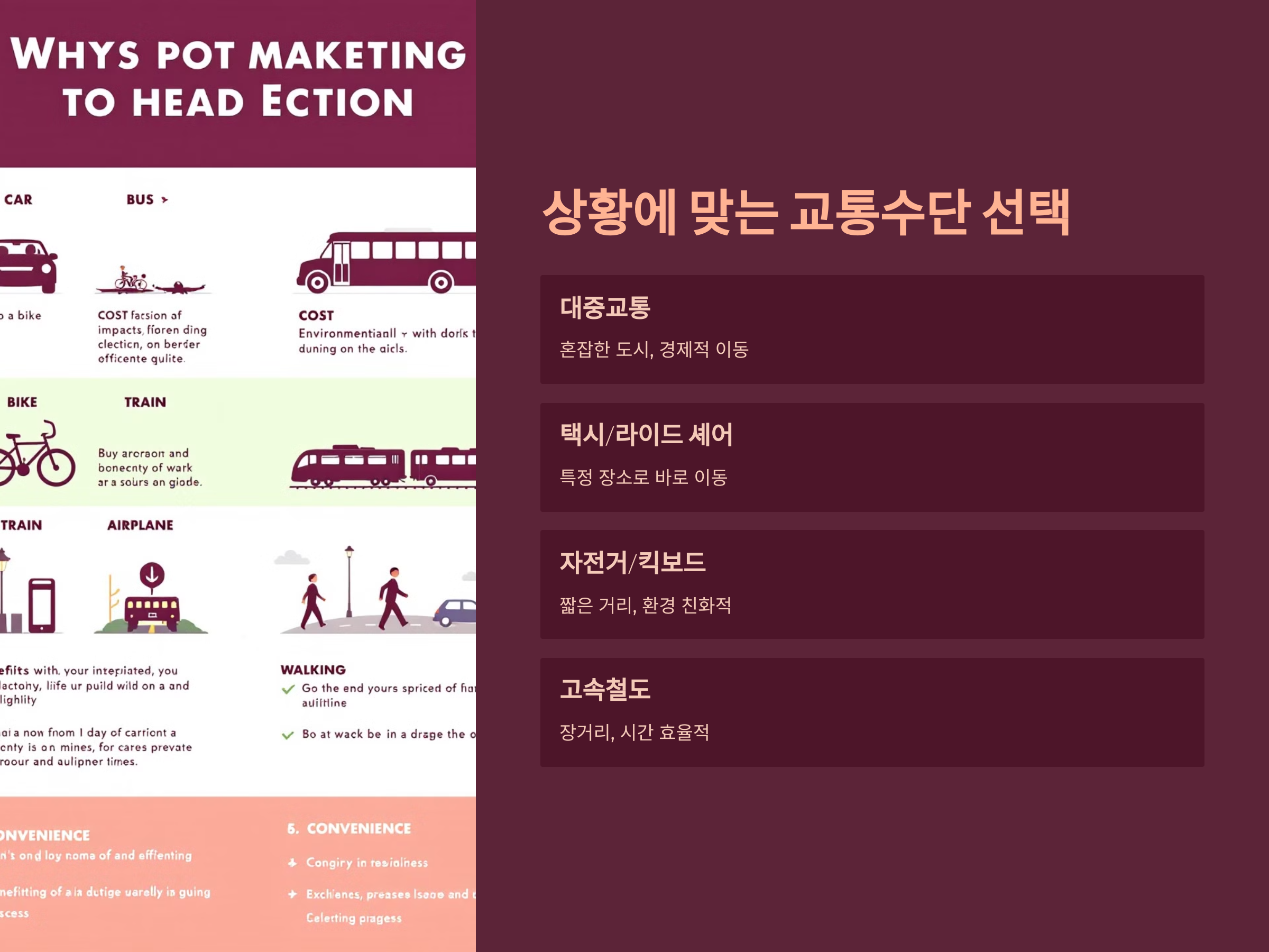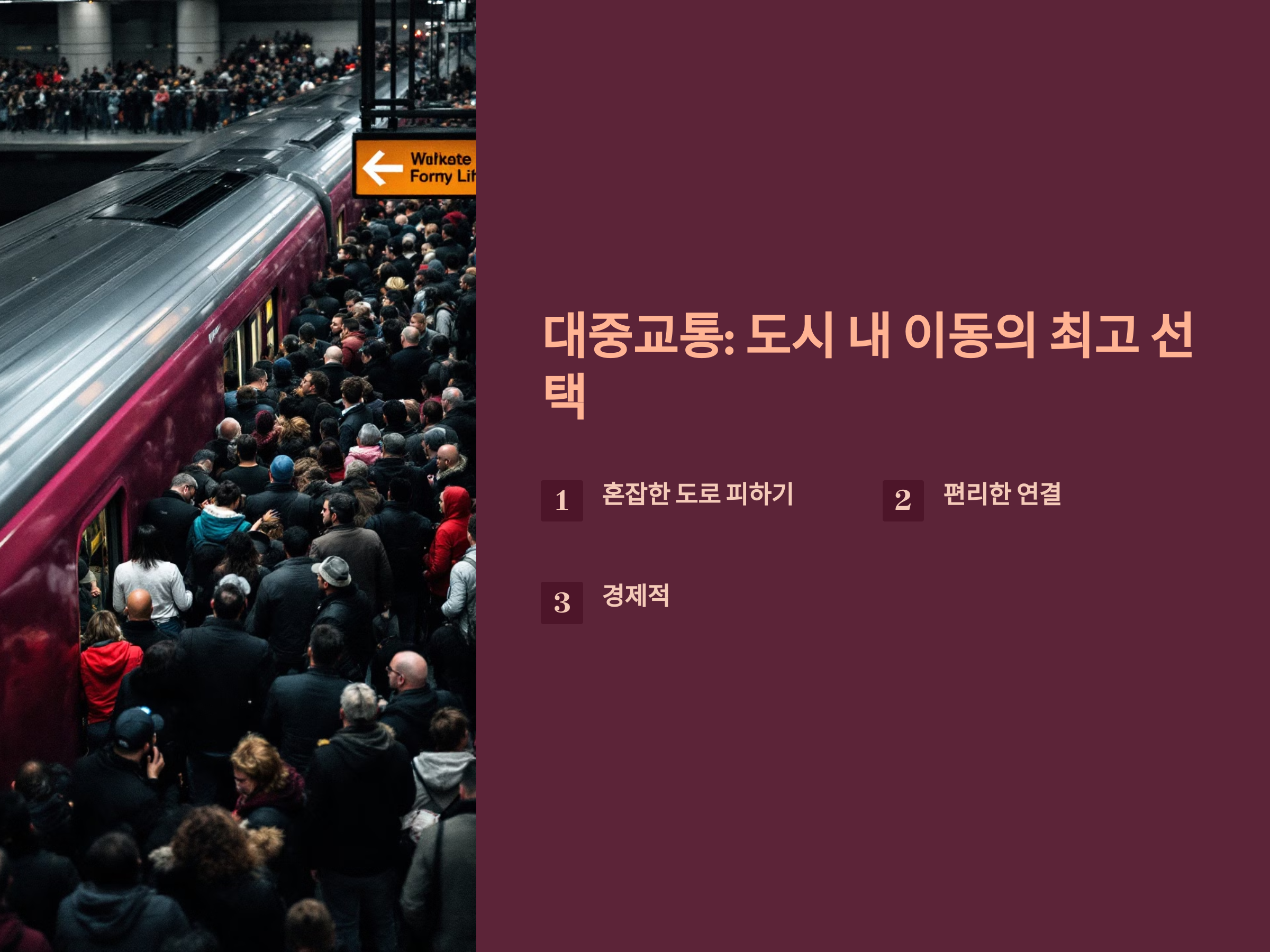 - 경제적: 주차비, 기름값, 차량 유지비 등을 고려하면 대중교통을 이용하는 것이 훨씬 경제적일 수 있습니다.