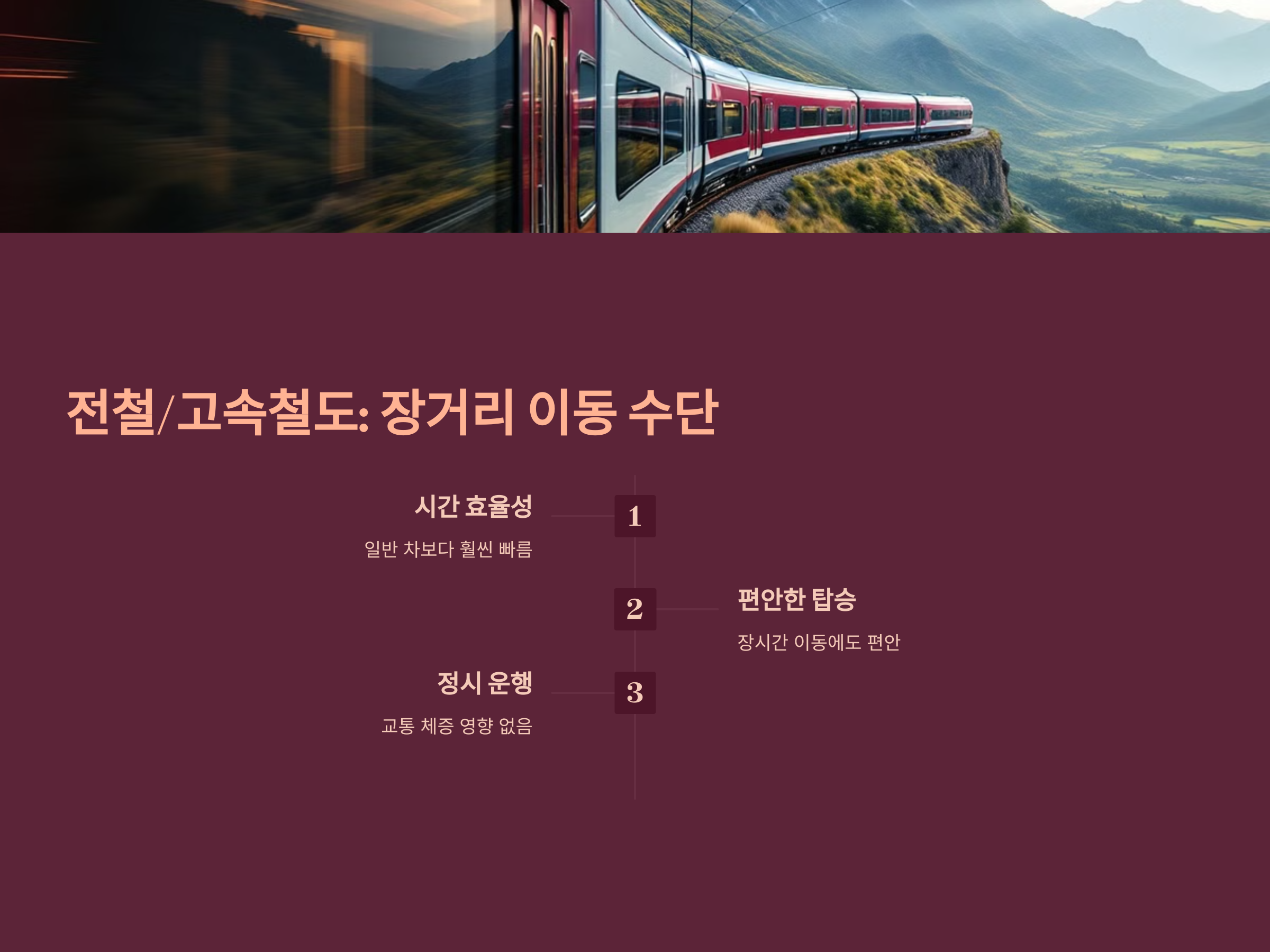 전철/고속철도: 장거리 이동을 위한 편리한 교통수단