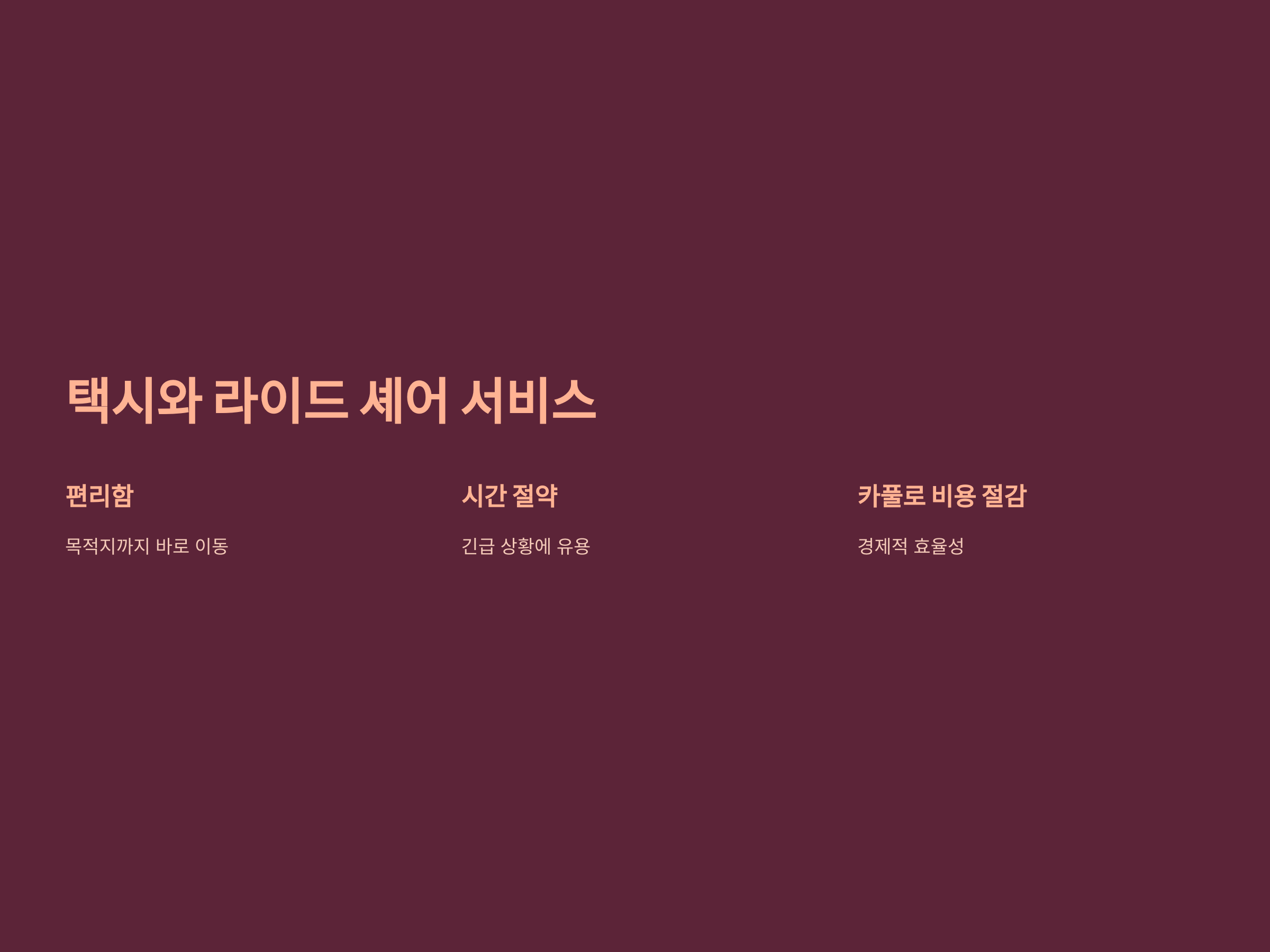 - 편리함: 택시나 라이드 셰어는 목적지까지 바로 이동할 수 있어 편리합니다. 지하철이나 버스처럼 환승할 필요가 없으며, 원하는 장소까지 정확하게 이동이 가능합니다.