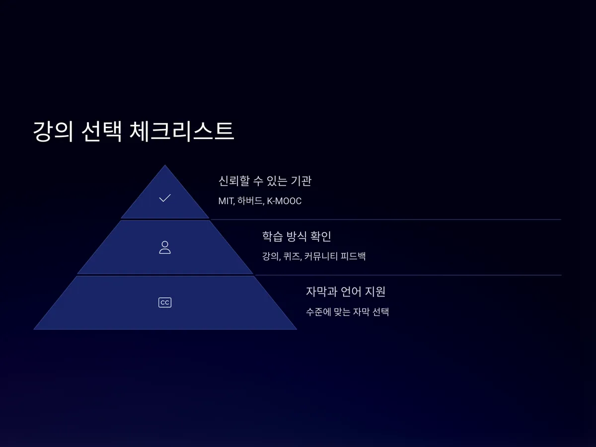 첫째, 강의 제공 주체가 신뢰할 수 있는 기관인지 확인해야 합니다. MIT, 하버드, 한국의 K-MOOC 같은 공신력 있는 기관이 제공하는 강의는 커리큘럼과 자료의 신뢰도가 높습니다.