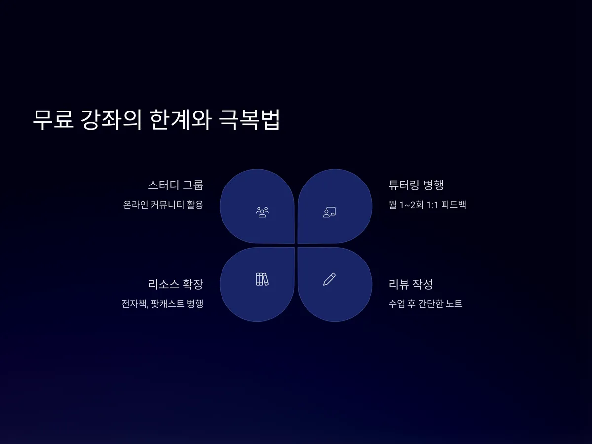 무료 강좌는 분명 훌륭한 자원입니다. 하지만 그 한계도 분명합니다. 예를 들어, 학습 지속 동기 부여 부족, 개인화 부족, 실시간 피드백 부재 등이 대표적입니다.