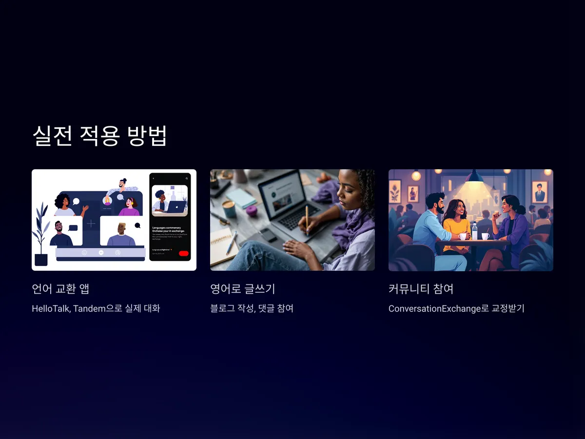 배운 영어를 실전에서 적용하는 것이야말로 진짜 실력을 만드는 단계입니다. 이를 위해 온라인 영어 커뮤니티, 언어 교환 프로그램, 실제 외국인과의 회화 실습 기회를 적극적으로 찾아야 합니다.
