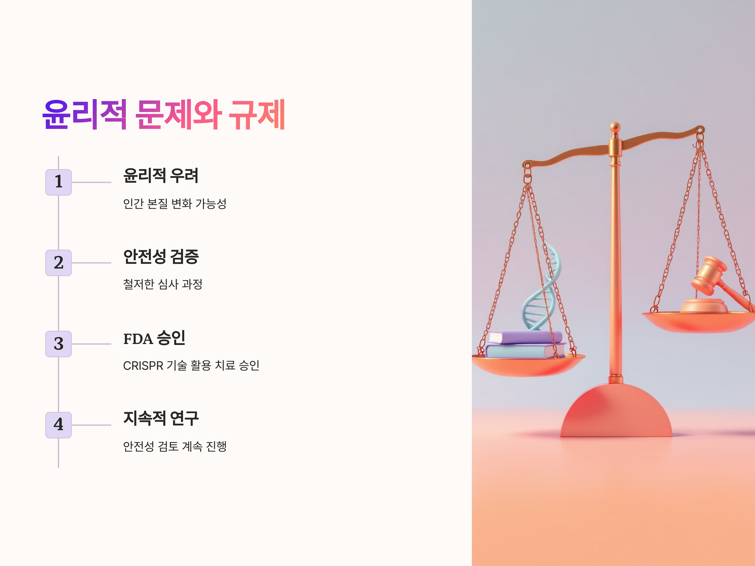 유전자 편집 기술이 실용화되는 과정에서 가장 큰 장벽 중 하나는 윤리적인 문제와 규제입니다. 일부에서는 유전자 편집이 인간의 본질적인 특성을 변화시킬 수 있는 위험한 기술이라고 우려했으며, 특히 수정된 유전자가 후세에 전달될 수 있는 가능성도 논란을 일으켰습니다. 그럼에도 불구하고, 유전자 편집 치료가 승인되기까지 수많은 안전성 검증과 규제 기관의 철저한 심사를 거쳤습니다.