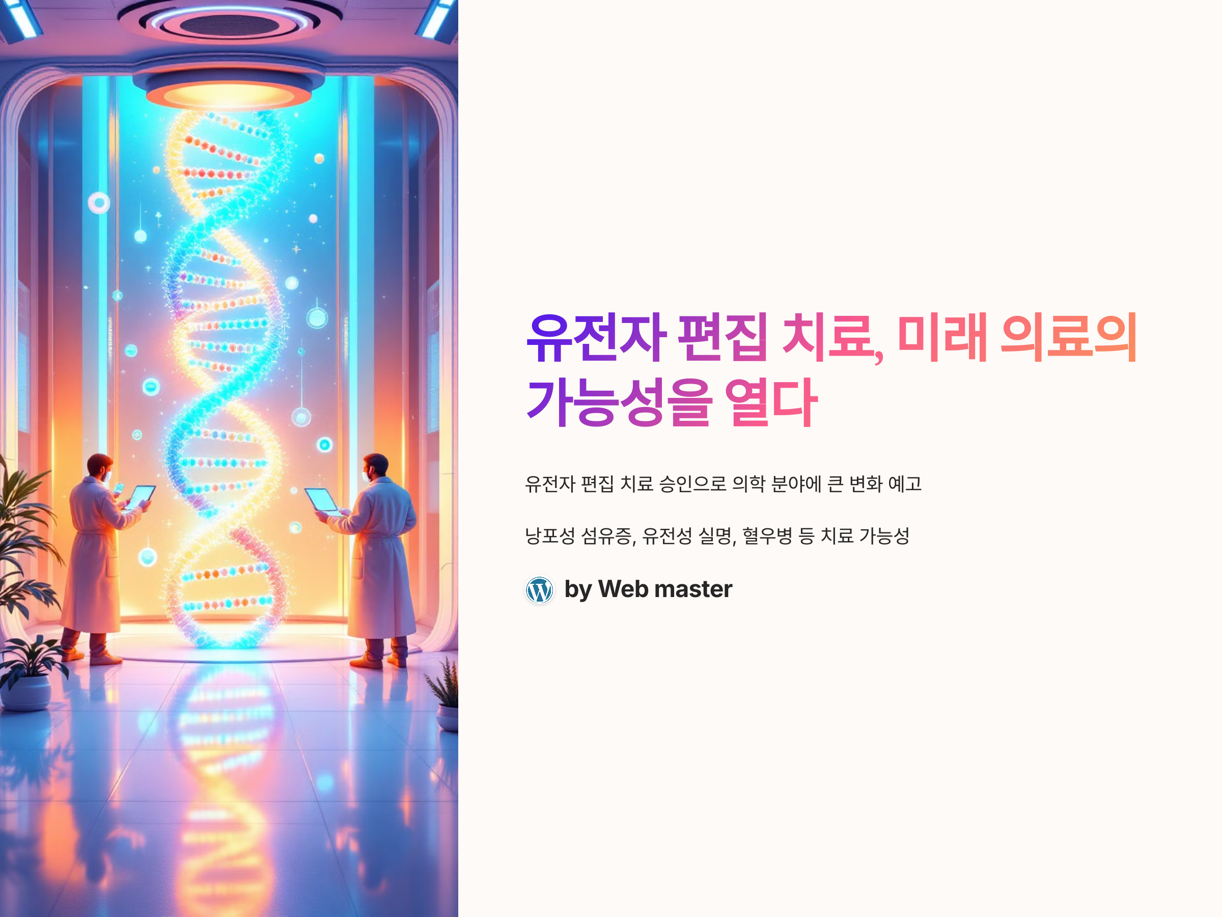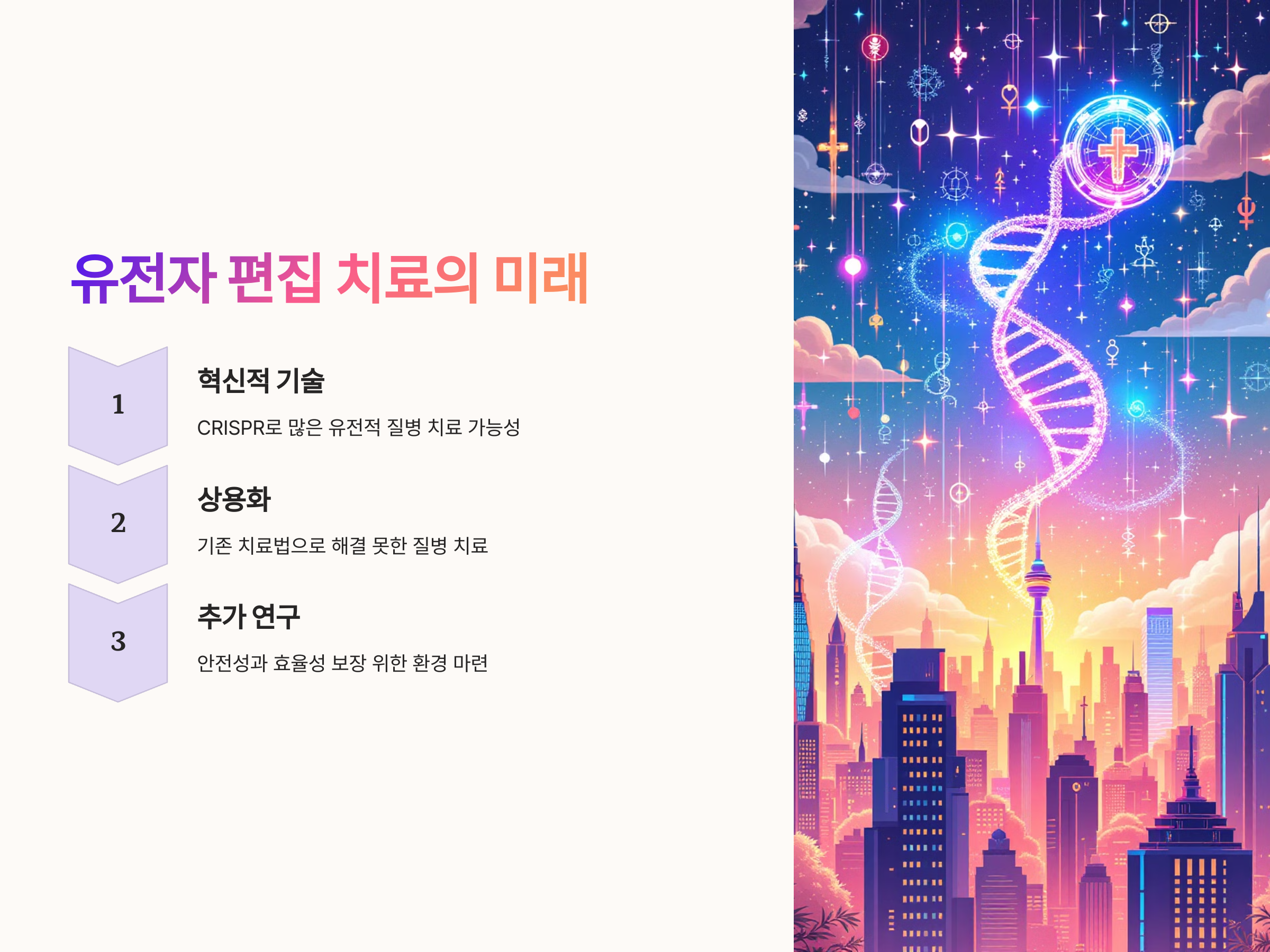 유전자 편집 치료는 이제 단순한 상상이 아닌, 현실이 되었습니다. CRISPR와 같은 혁신적인 기술 덕분에 우리는 많은 유전적 질병들을 치료할 수 있는 가능성을 보게 되었습니다. 이러한 기술이 본격적으로 상용화되면, 기존의 치료법으로는 해결할 수 없었던 많은 질병들이 새로운 방법으로 치료될 수 있을 것입니다.