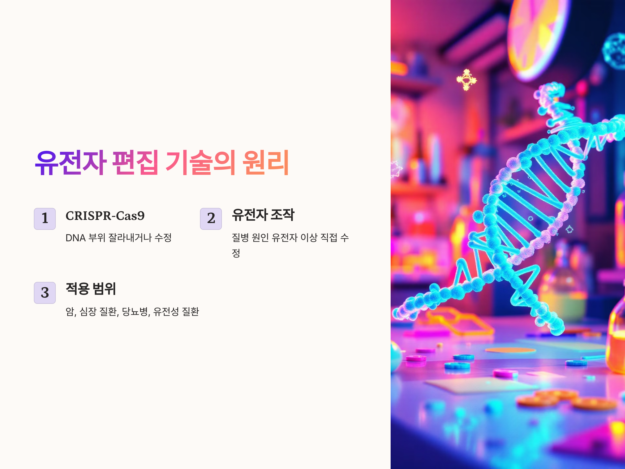 유전자 편집 기술은 우리가 자신의 유전자를 정확하게 수정할 수 있게 만들어주는 기술입니다. 가장 유명한 기술인 CRISPR-Cas9는 특정 DNA의 부위를 잘라내거나 수정하여 유전자를 조작하는 방식으로, 생명과학 분야에서 엄청난 혁신을 가져왔습니다. 이러한 기술은 여러 질병의 근본적인 원인인 유전자 이상을 직접적으로 수정할 수 있기 때문에, 그 치료 가능성이 매우 높습니다.