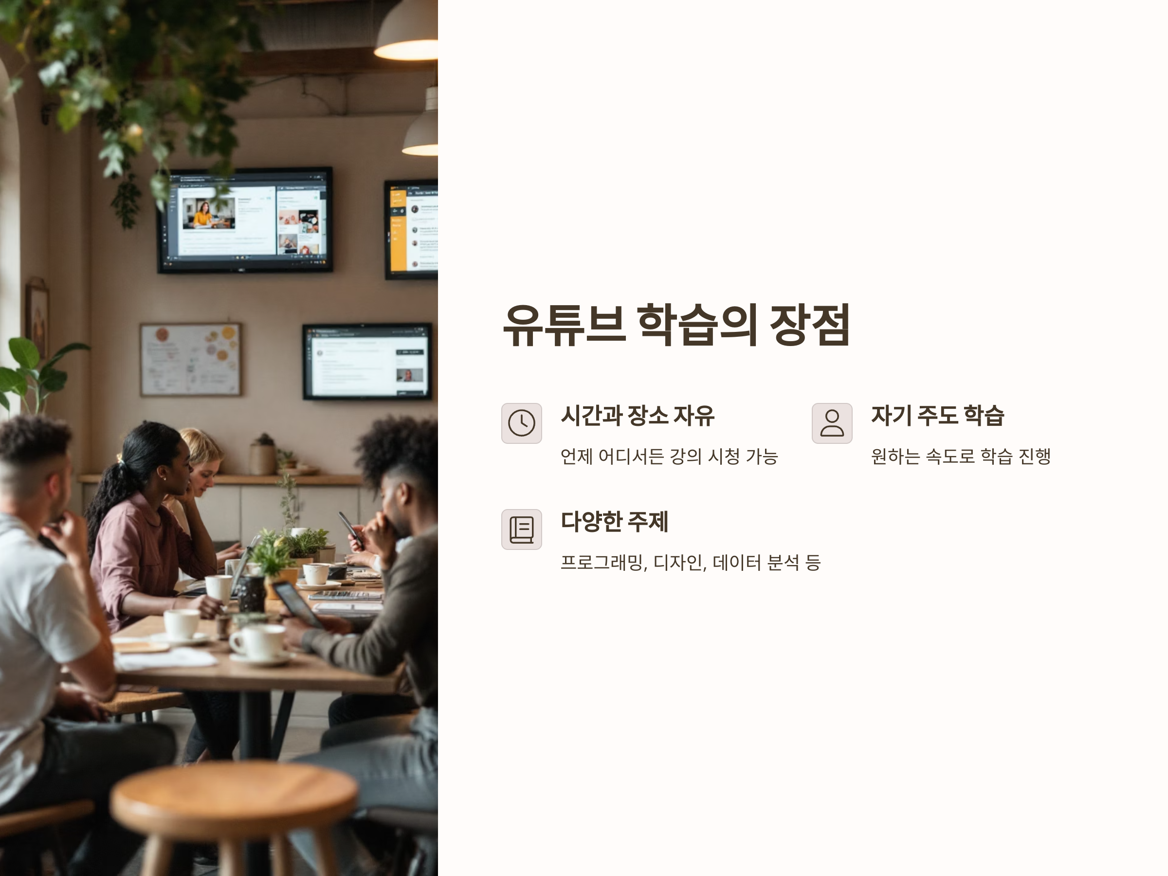 유튜브에서 제공하는 무료 강좌는 시간과 장소에 구애받지 않고 학습할 수 있다는 큰 장점이 있습니다. 이러한 학습 방식은 특히 바쁜 일정을 가진 사람들에게 유리합니다. 유튜브에서는 기초부터 고급 기술까지 폭넓은 강좌가 제공되며, 주제나 난이도에 상관없이 자신에게 맞는 강의를 선택할 수 있습니다. 또한, 반복해서 학습할 수 있어 이해도가 높아질 때까지 자유롭게 학습할 수 있는 유연성을 제공합니다.