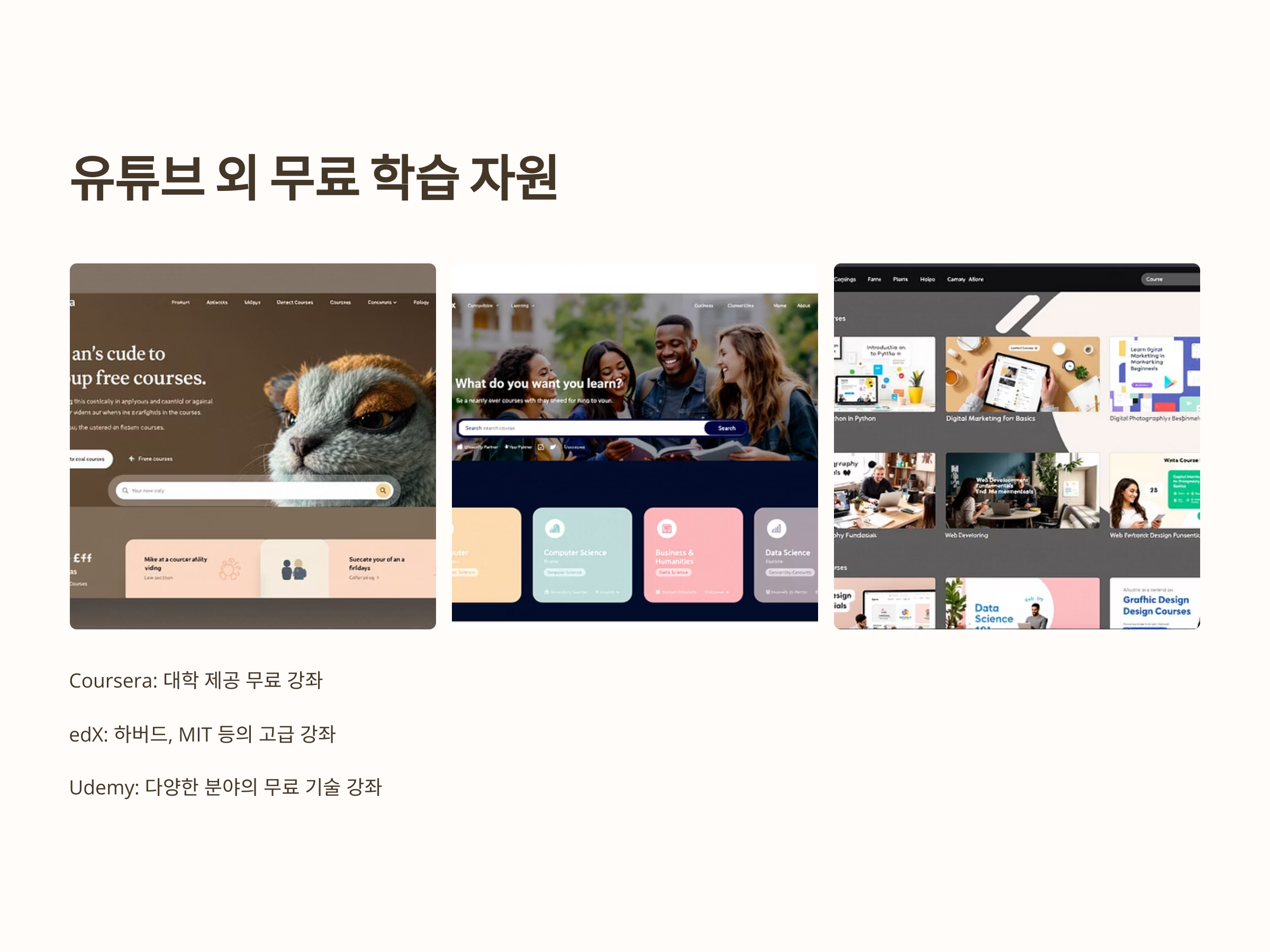 유튜브 외에도 다양한 무료 학습 자원이 있습니다. 무료로 제공되는 온라인 강좌, 커뮤니티 및 자료들은 새로운 기술을 배우는 데 큰 도움이 됩니다.