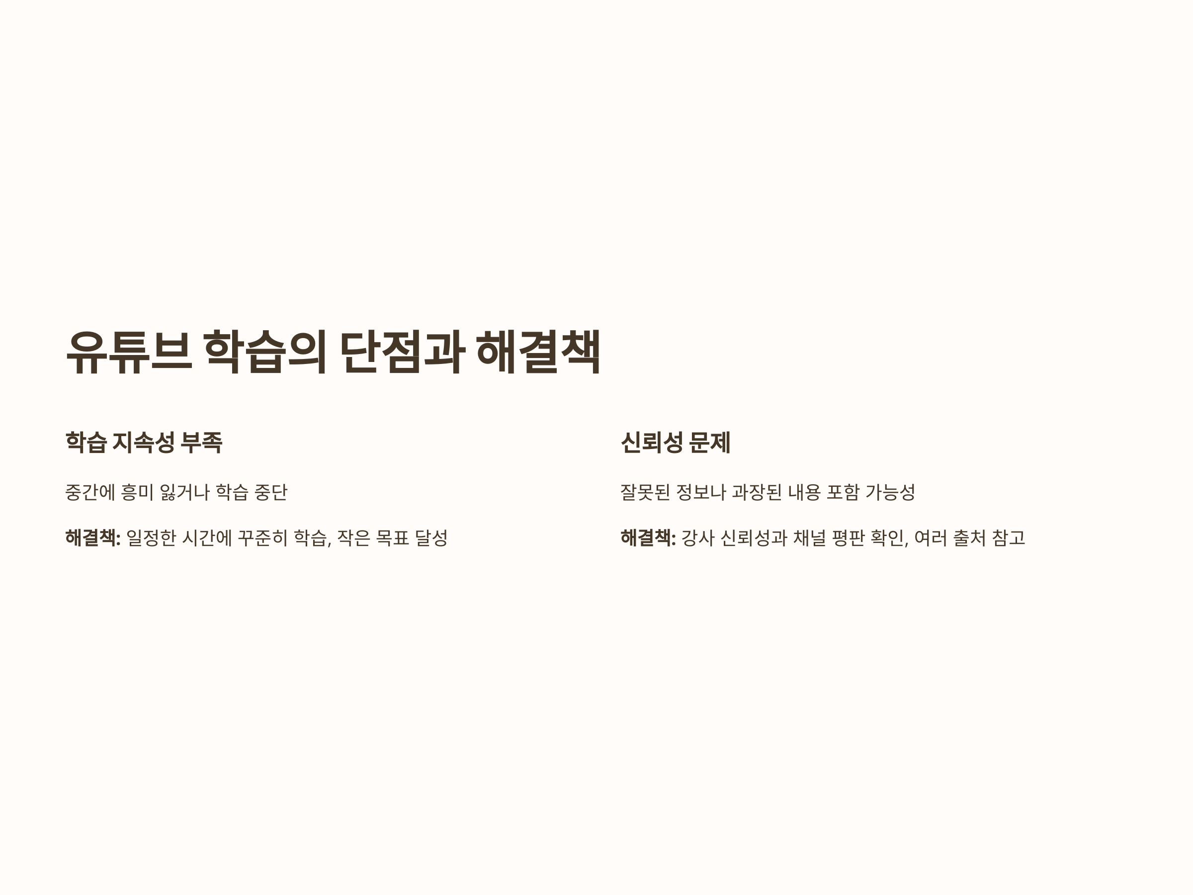 유튜브 학습은 매우 유익하지만, 몇 가지 단점도 존재합니다. 이를 해결하기 위한 방법을 알아보겠습니다.