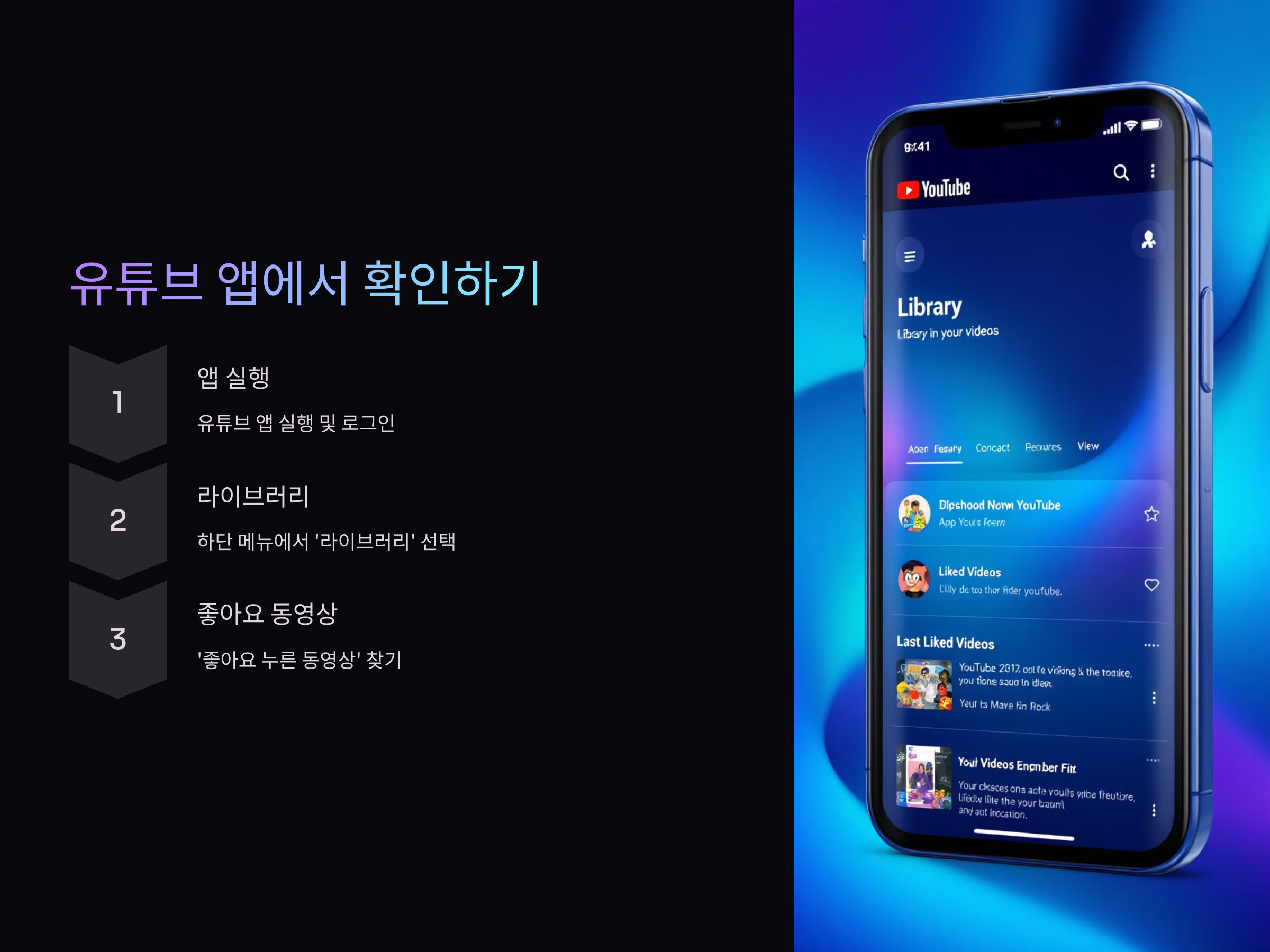 - 라이브러리 화면에서 '좋아요 누른 동영상'을 찾아 원하는 영상을 확인합니다.