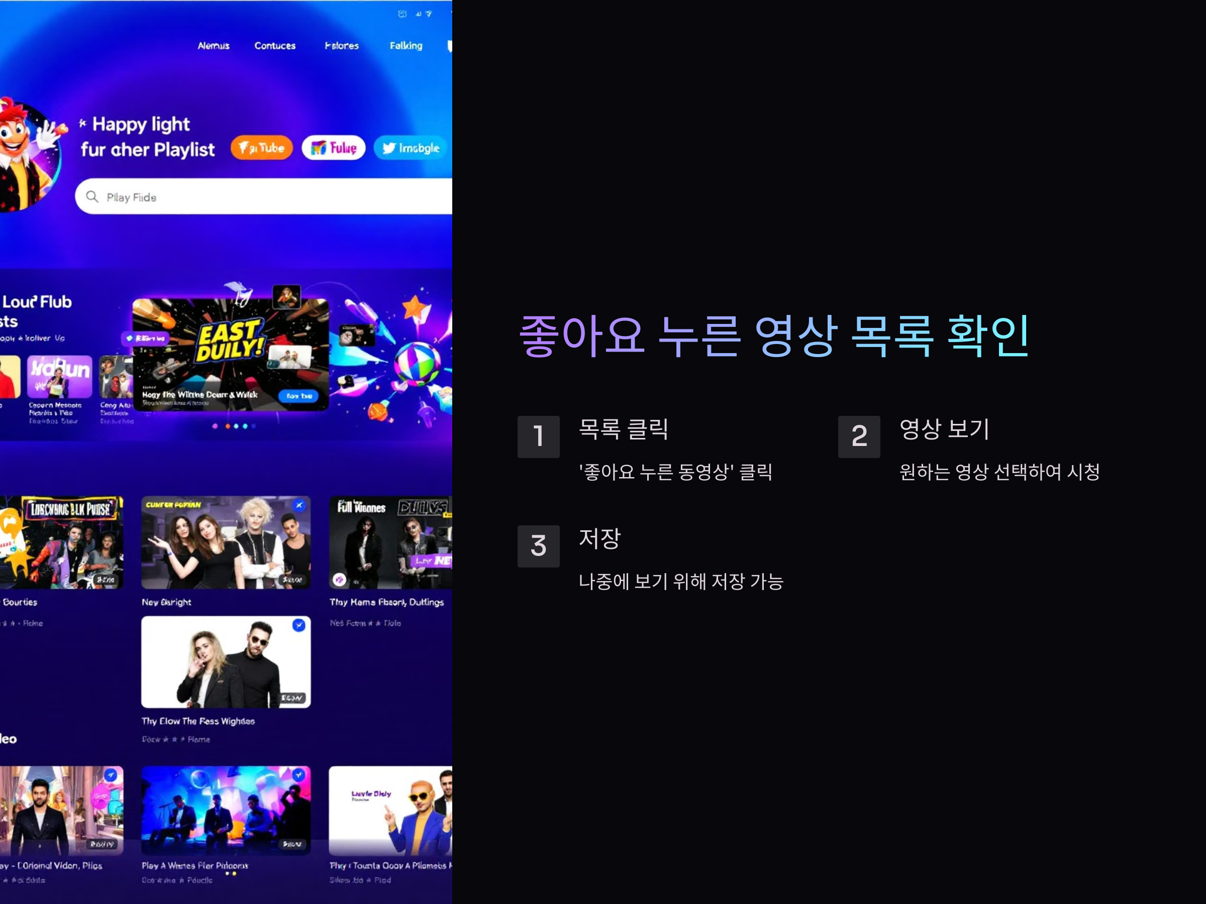 - '좋아요'를 눌렀지만 나중에 특정 카테고리로 분류하고 싶다면, 영상에 '저장' 버튼을 눌러 다른 재생목록에 추가할 수 있습니다.
